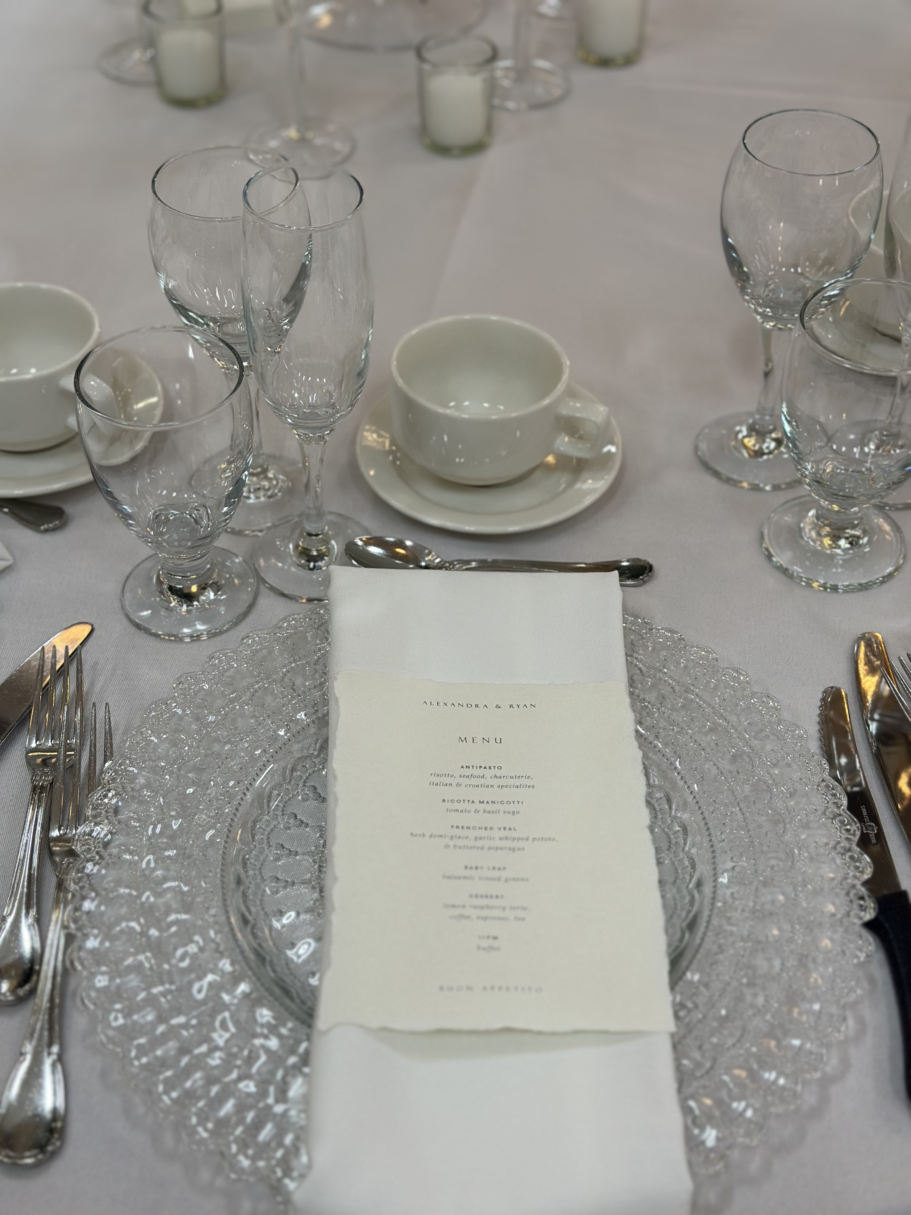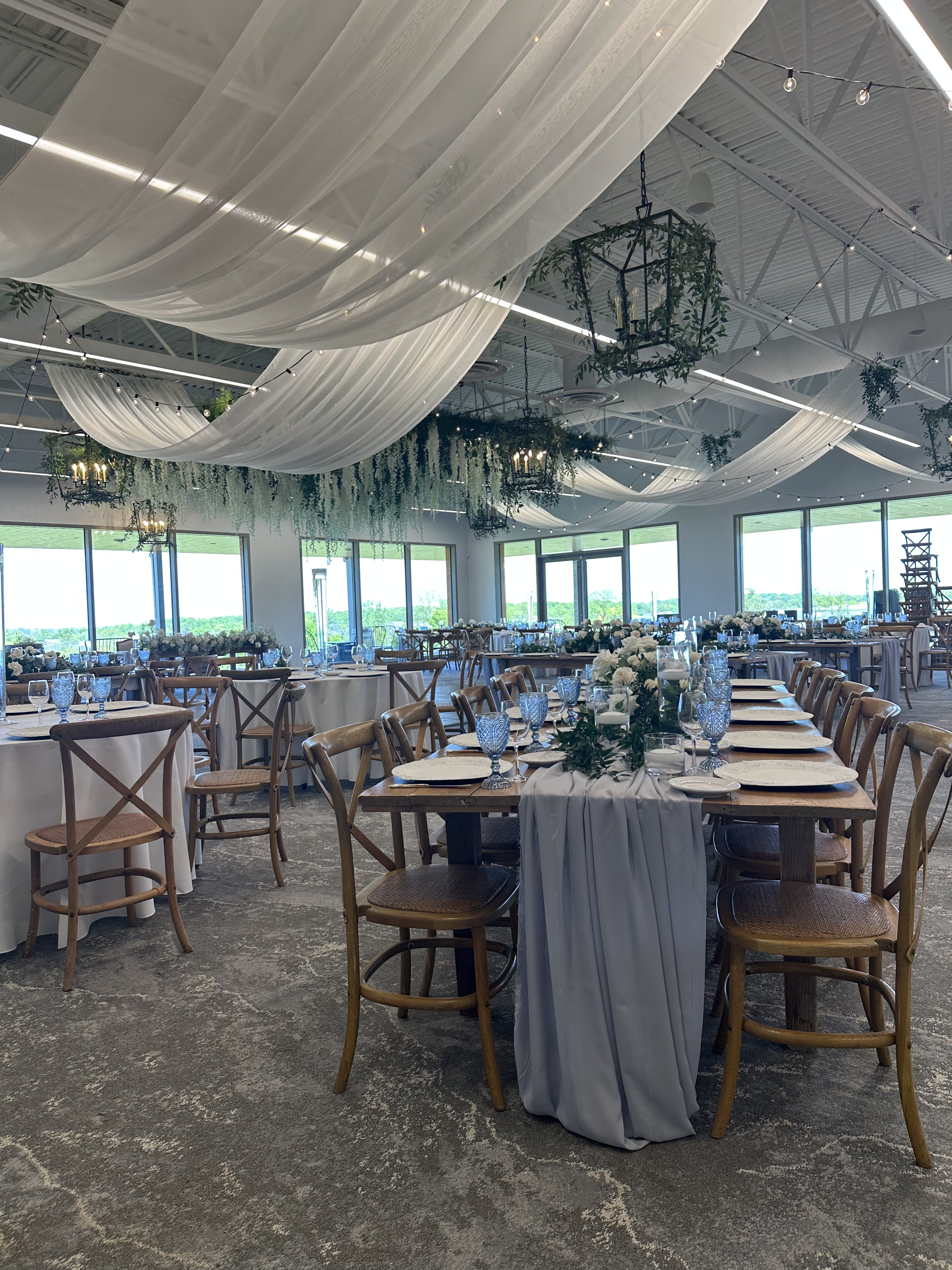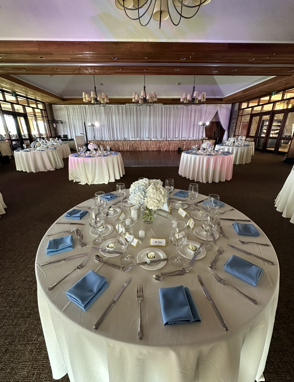 To further elevate the ambiance, we incorporated light blue goblets into the table settings. These elegant touches added a pop of color that harmonized beautifully with the soft floral arrangements, creating a cohesive and inviting atmosphere for guests.