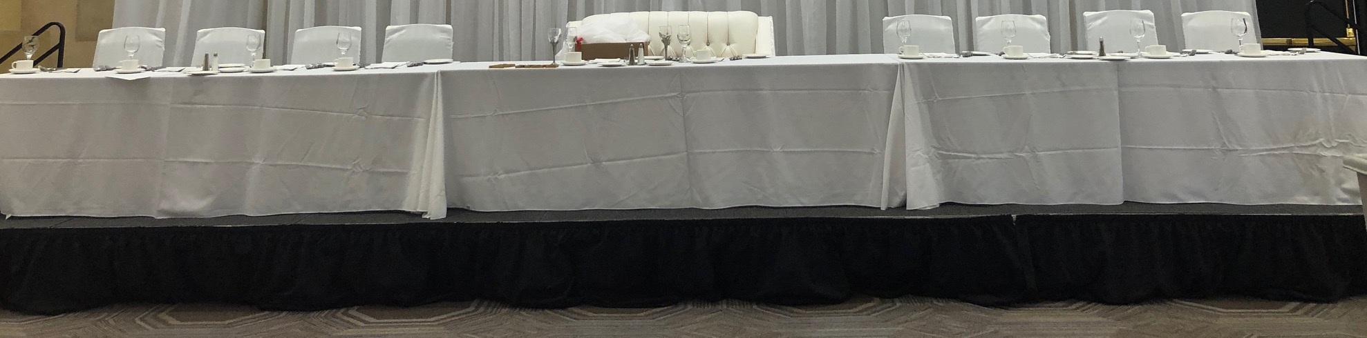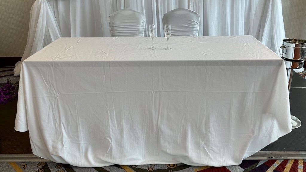 While basic linens are a good starting point, there are many other things you can do to make the head table stand out but the most important is adding an overlay, sequin, velvet or draped linen.