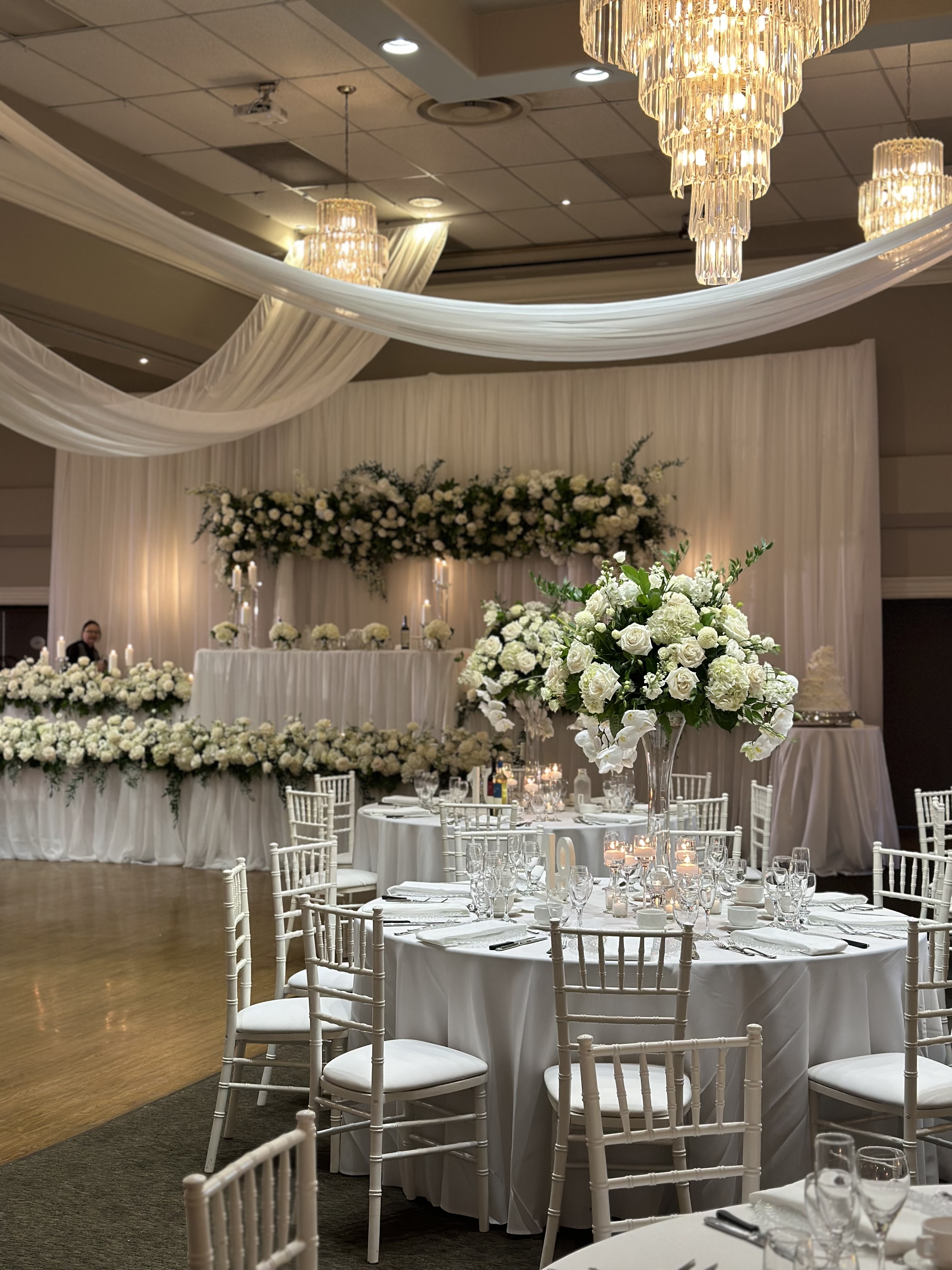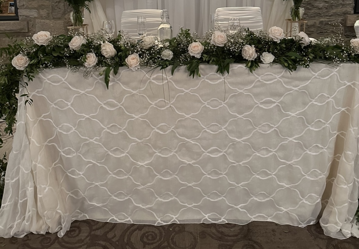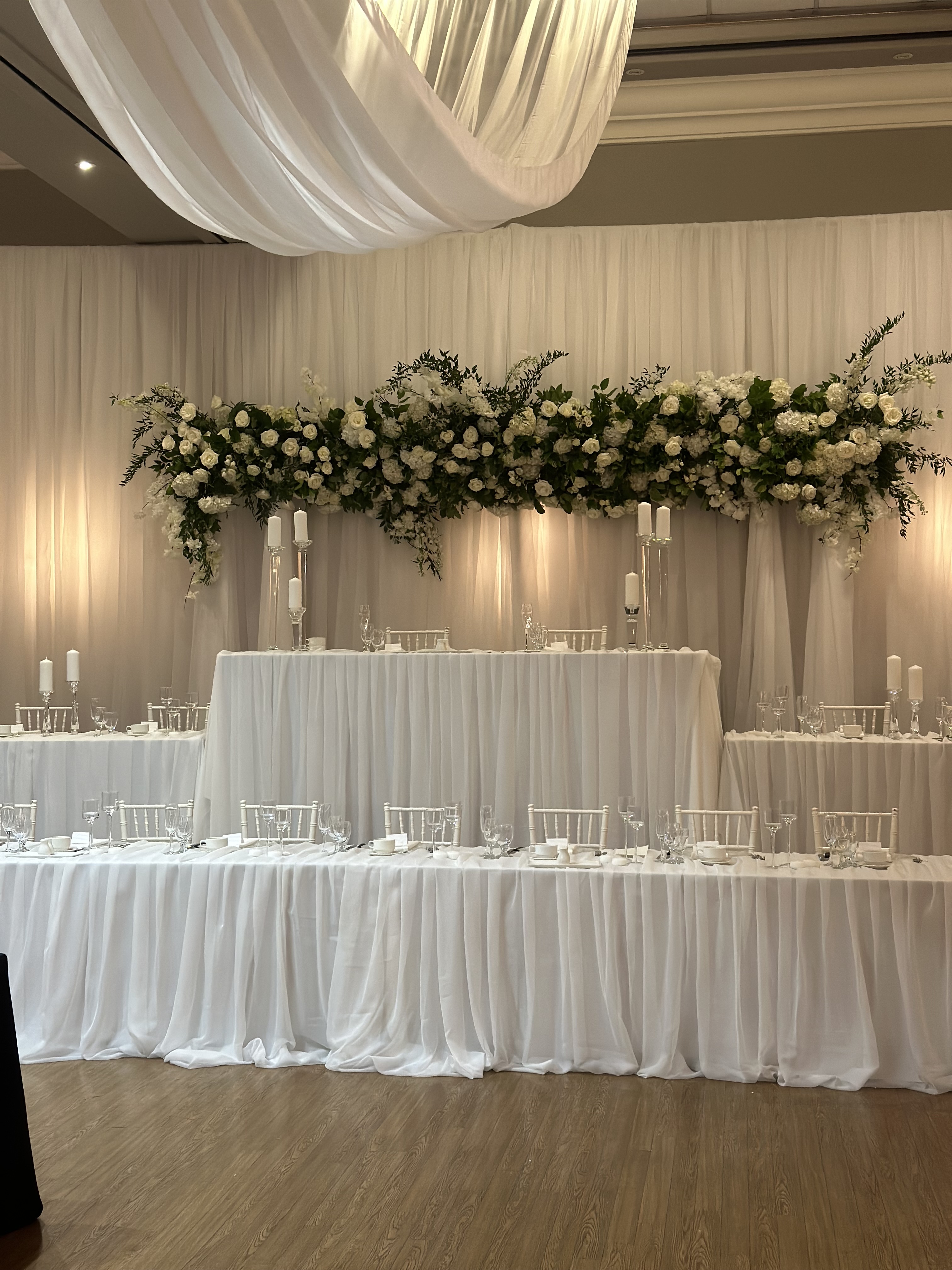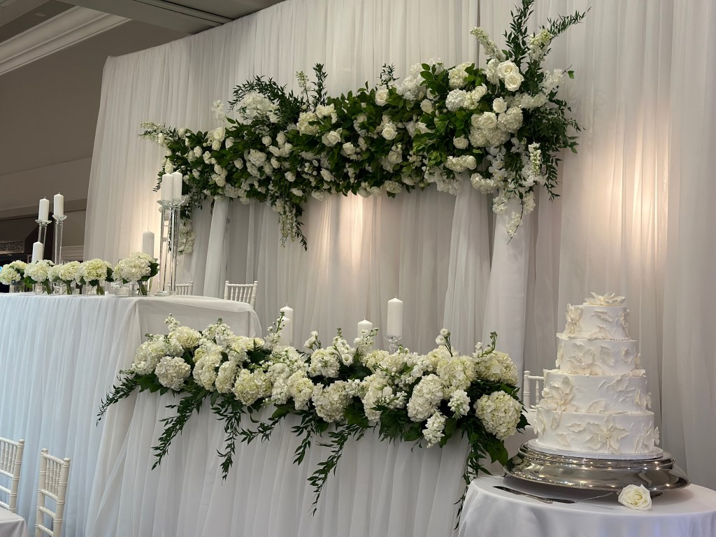 For the first time ever; we had the opportunity to design a custom large-scale floral installation behind the head table and the result was nothing short of breathtaking. Imagine a stunning wall of lush, cascading florals in whites and greens, expertly arranged to create a textured, organic masterpiece. The installation was the perfect fusion of opulence and romance; with layers of roses, spray roses, lisianthus, hydrangeas, stock, orchids, delphiniums and greenery intertwined to evoke a sense of natural elegance, as if the flowers were almost alive, reaching toward the guests. No stunning floral installation is complete without a beautiful backdrop to frame it.