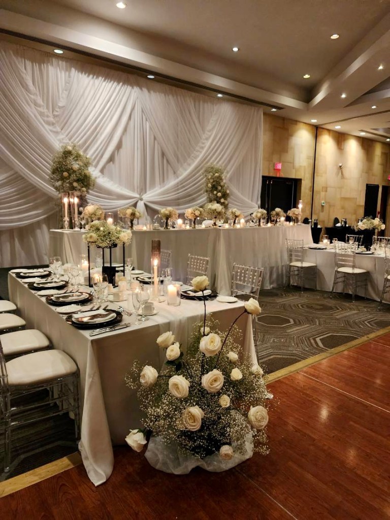 The first wedding took place in the exquisite Grand Ballroom at White Oaks. We were delighted to enhance the ambiance with a stunning backdrop and luxurious linens for the head table.