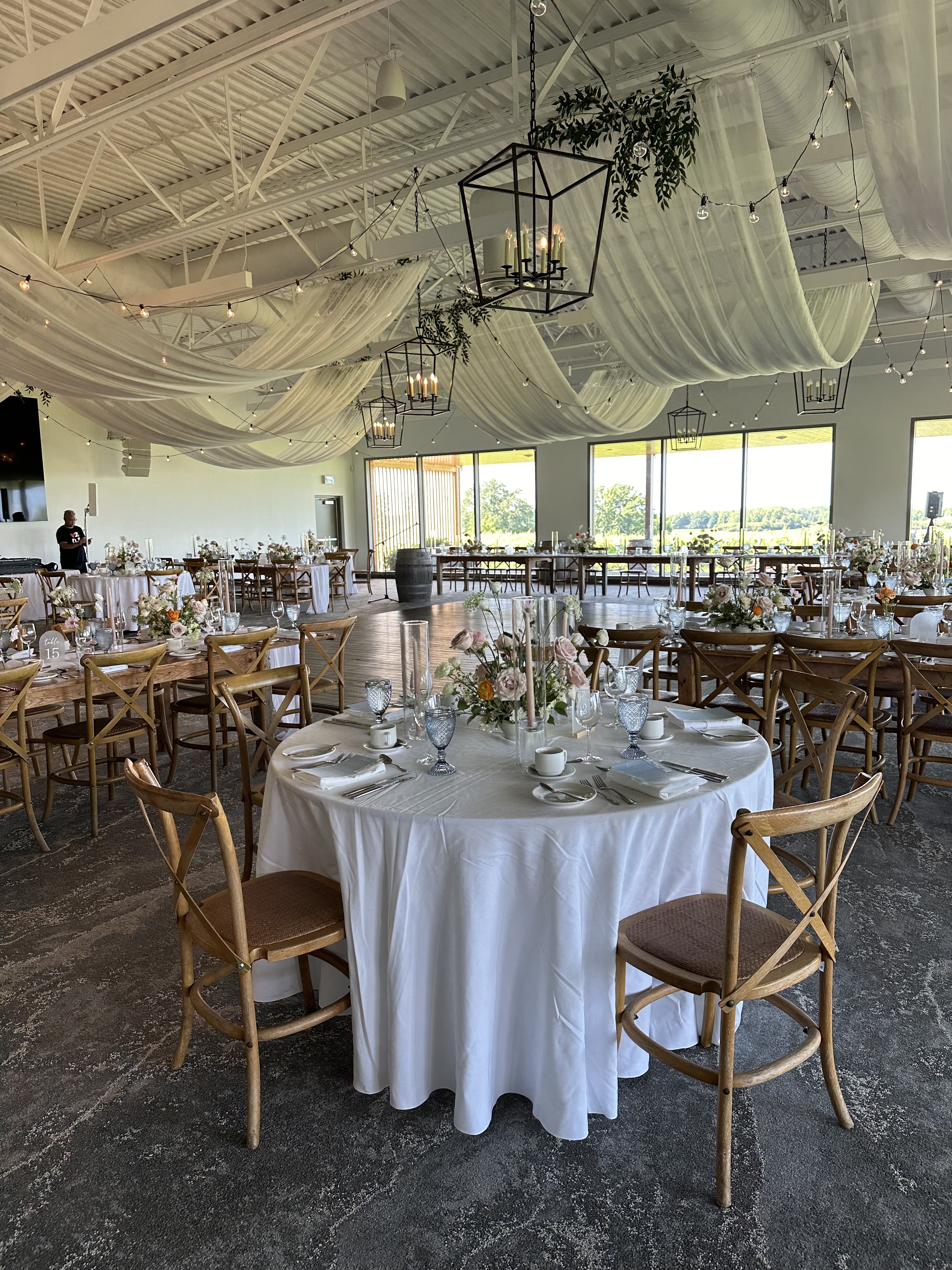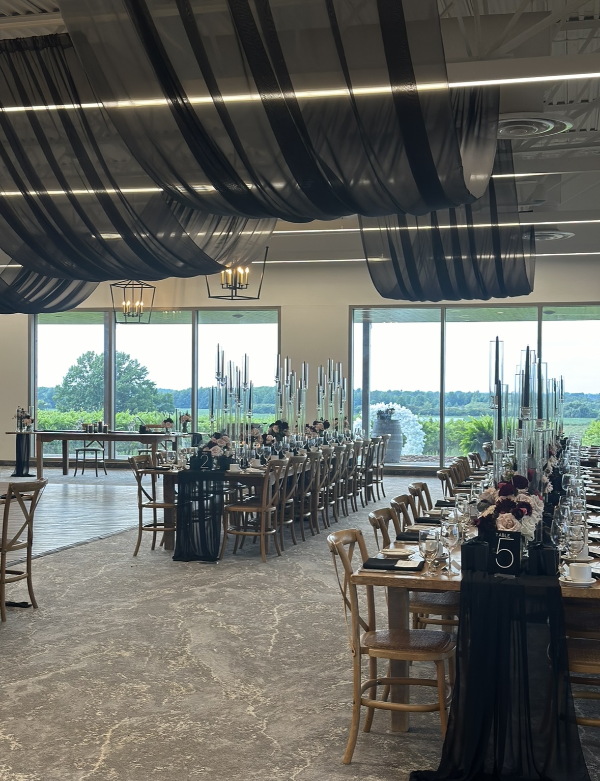 We had the pleasure of providing black ceiling draping for this stunning wedding. Draping a ceiling gives the room elegance, flow and can completely change a room. This couple wanted a moody black feel for their special day. The bride did all of the flowers herself!!!! The candelabra’s where provided by @latkatlinens