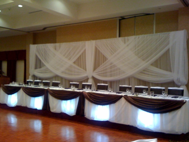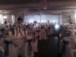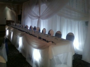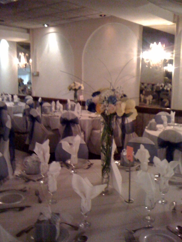 The accent color was navy blue, which was used in the organza chair sashes that were tied in a generic bow style. There was also blue in the centerpieces and flower petals at the front of the head table for that little extra touch.