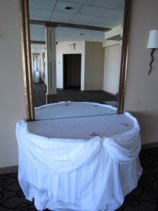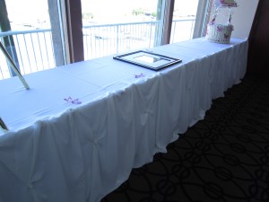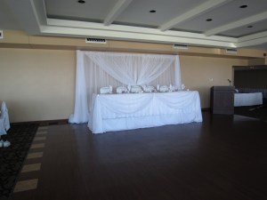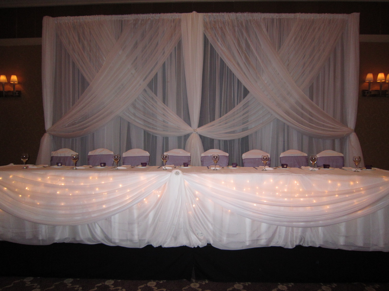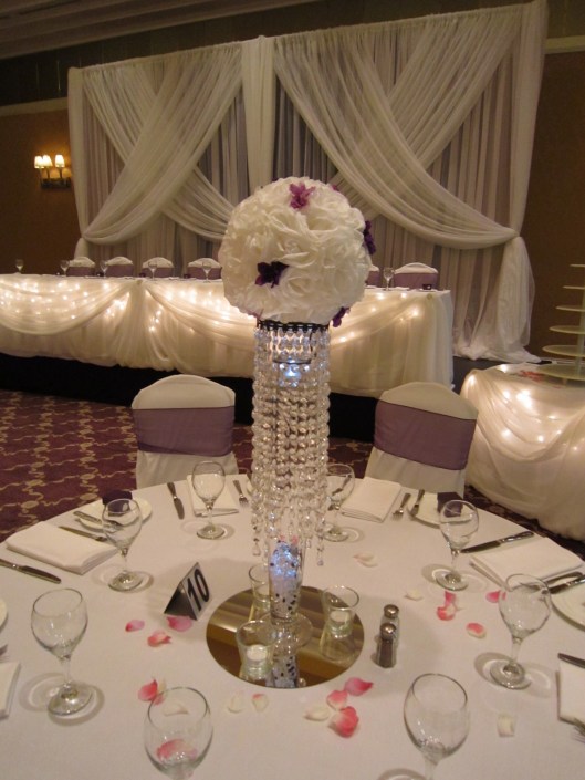 This wedding we did a backdrop, head table and cake table draping with icicle lights. We also had the pleasure of setting up our crystals centerpieces with the white flower balls. We added a couple purple flowers in different shades and a little purple in the bottom of the vase, just to bring in a little more of the purple theme.