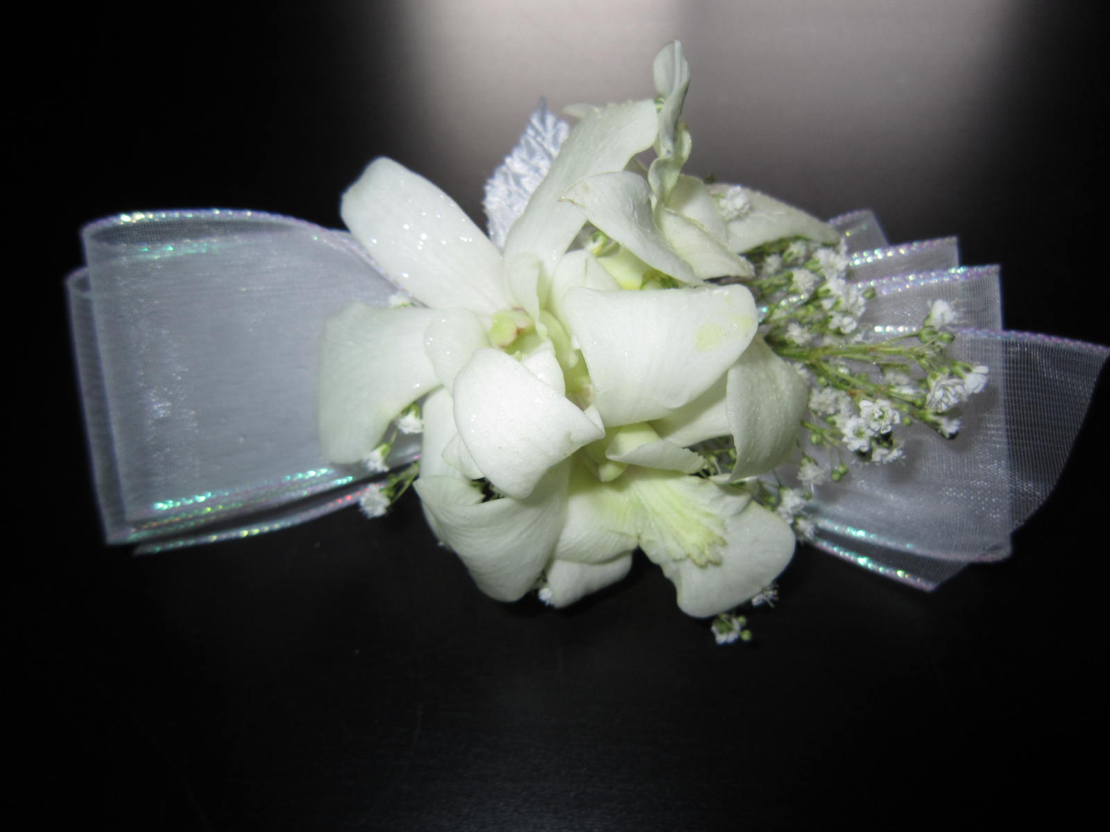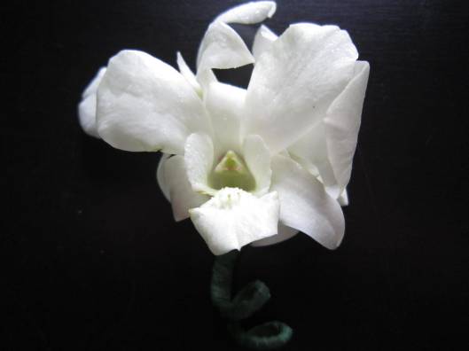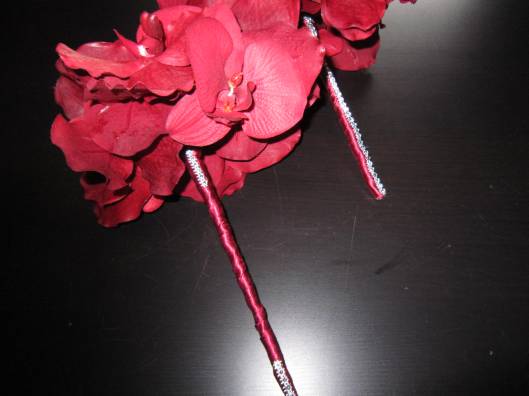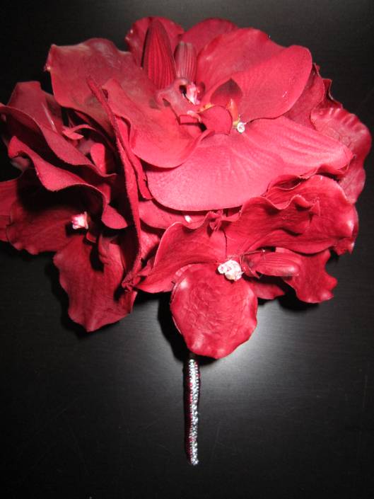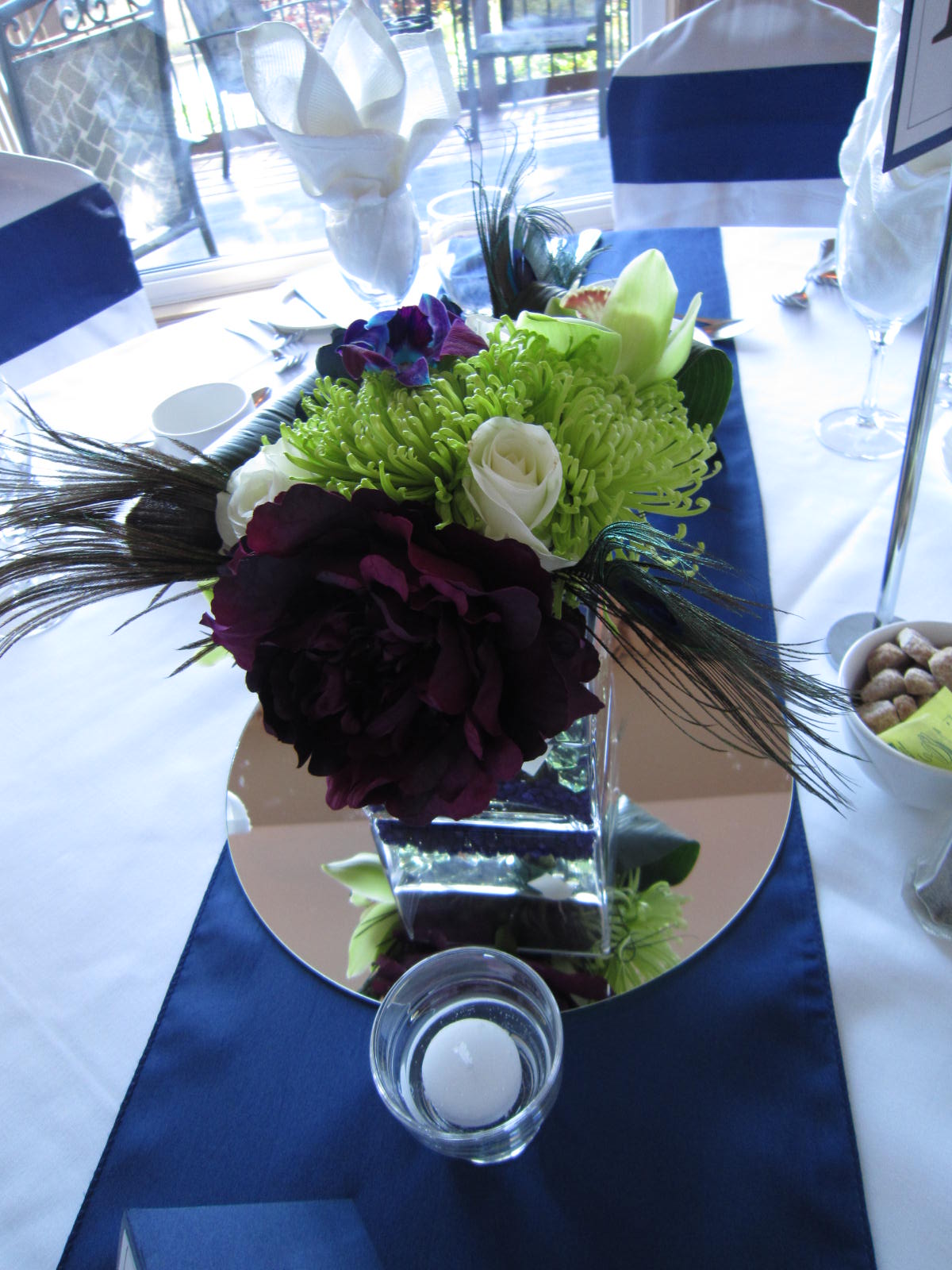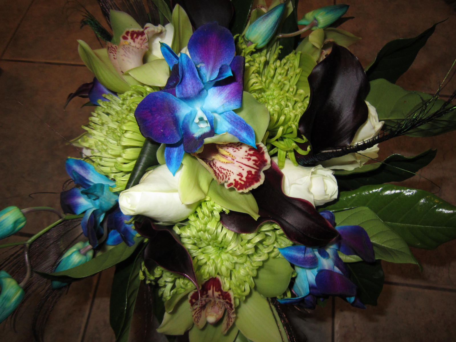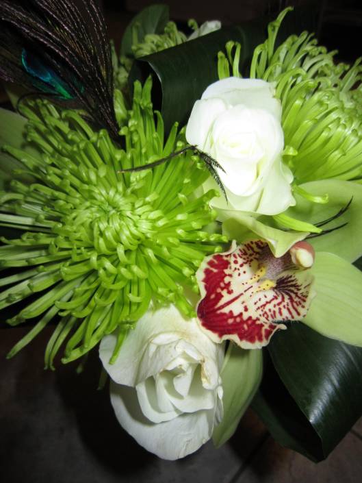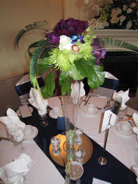 The bride wanted something to make a statement so we did centerpieces with mixed flowers and peacock feathers. To stay on budget, but still create a gorgeous effect we did tall/short on alternating tables. The flowers that where incorporated where; green spider mums, green cymbidium orchids; turquoise/purple dendrobium orchids, white roses and for finishing mixed greens and peacock feathers. (The darker blue and burgundy flowers where faux flowers. This is a great way to mix in some of the colors that may be hard to find in real flowers at a great cost. The bridal bouquet also have burgundy mini calla lilies.