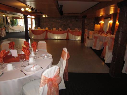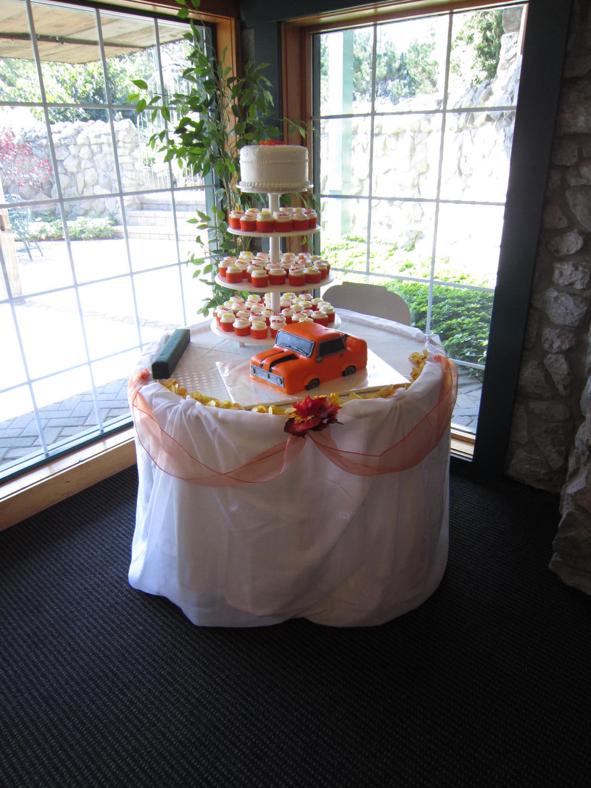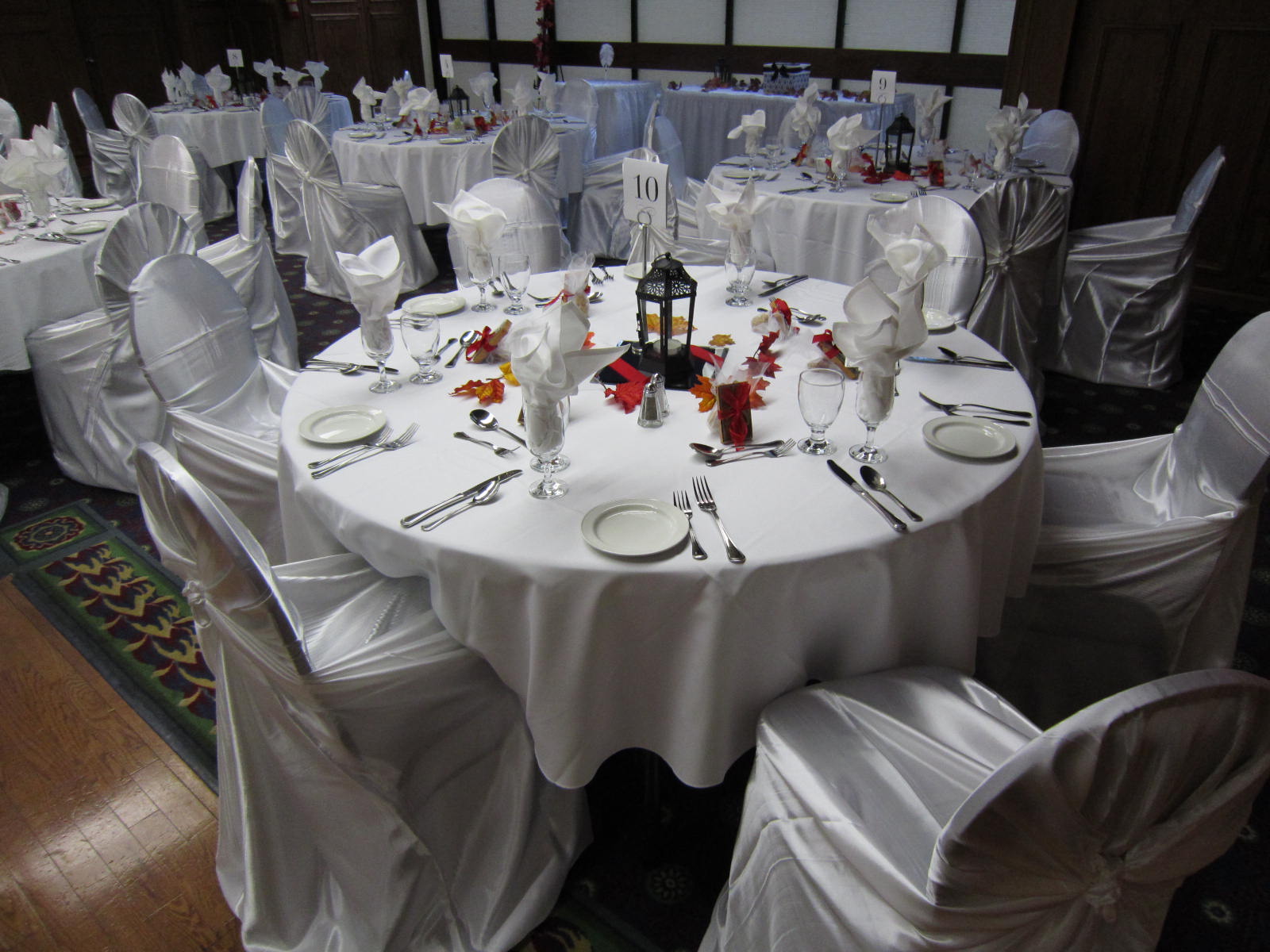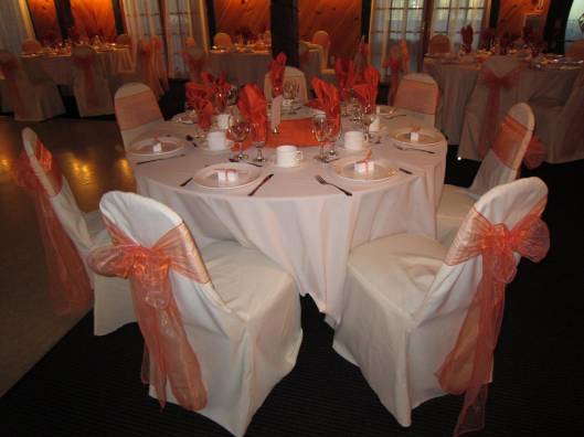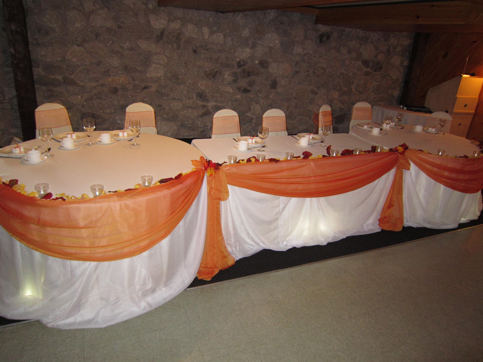 For decor we put on some white chair covers with navy blue satin sashes; we brought a little more navy blue in the table runners. We draped the head table and cake table with sheer white linen and added some additional flowers on the head table for that extra finishing look.