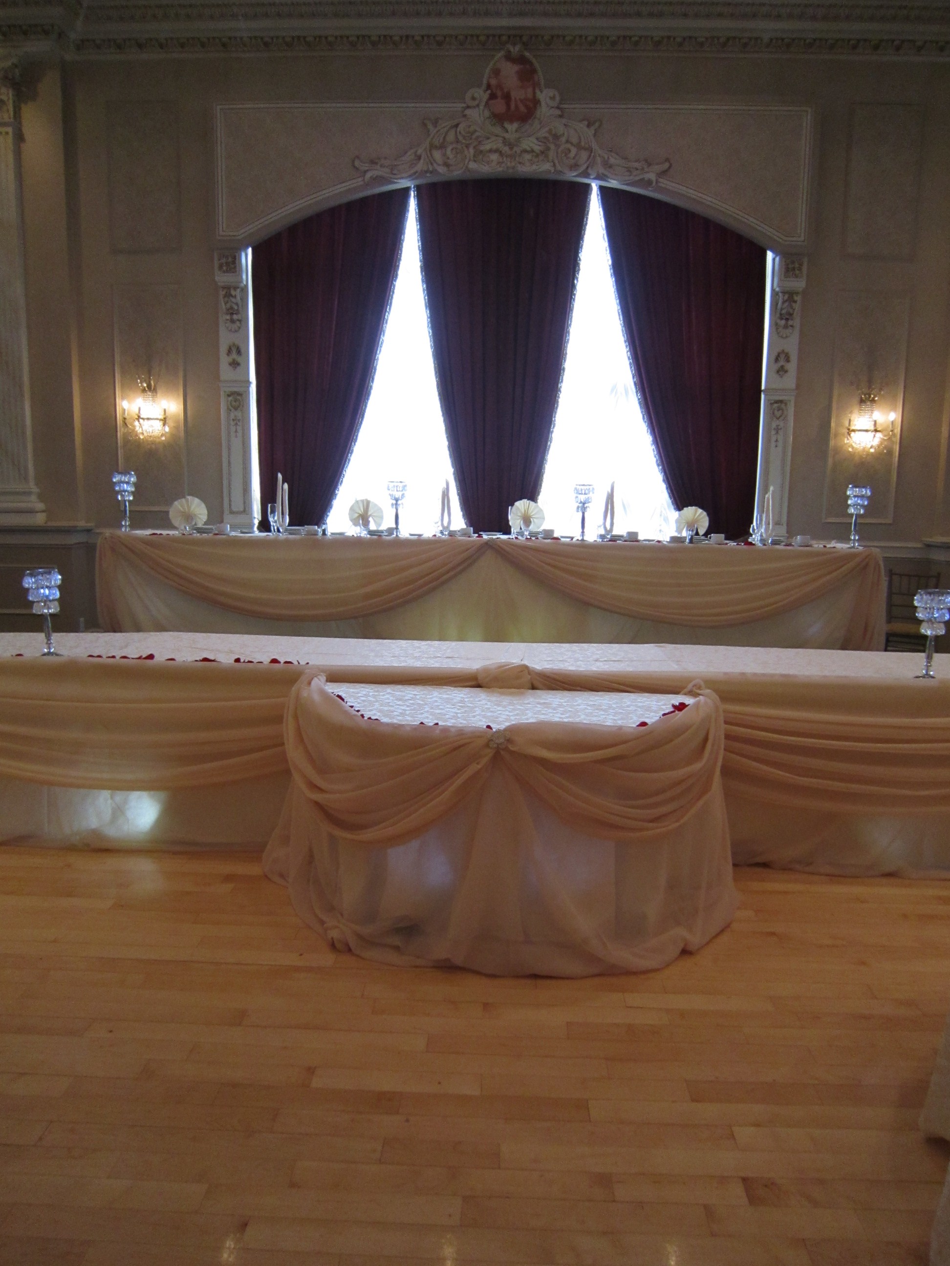 crystal lamps, ivory draping, ivory head table, le jardin, led spot lights, mississauga wedding decor, red rose petals, wedding decorator, woodbridge wedding decor