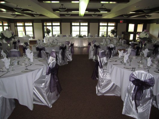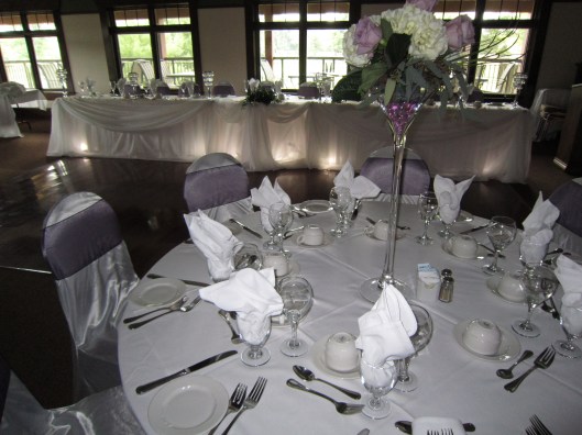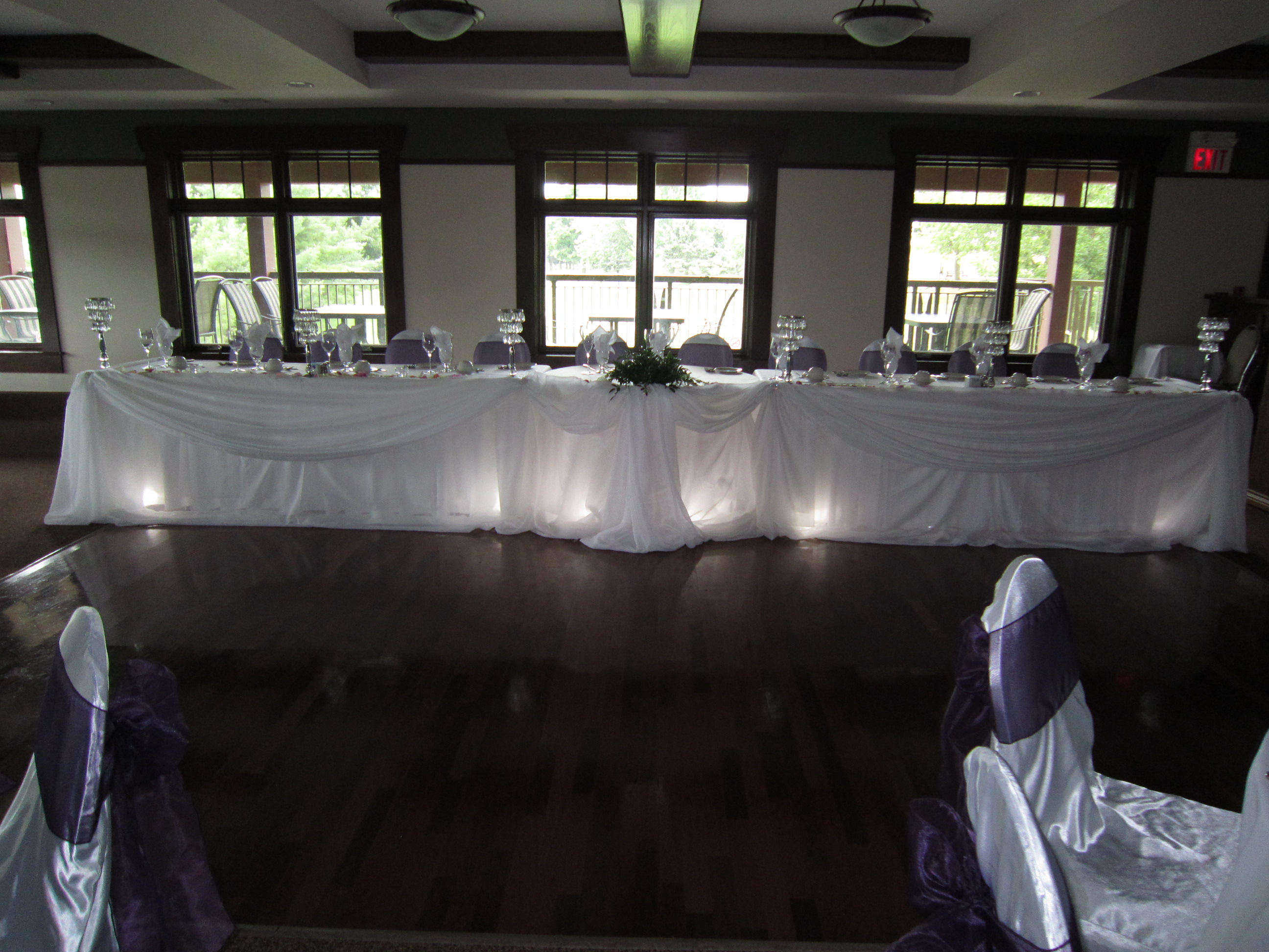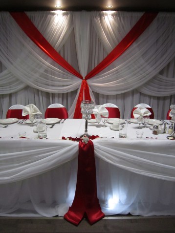 The venue was Club Capri in Thorold to complete their vision at the venue we provided white satin chair covers with red satin sashes. Full Head Table Cake Table Draping in sheer white linen with spot lights. We completed the tables with some red satin for the pop of color and out crystal embellishments and crystal chandeliers for the head table. Set The Mood Decor also provided a fancy style backdrop with red sating accent.