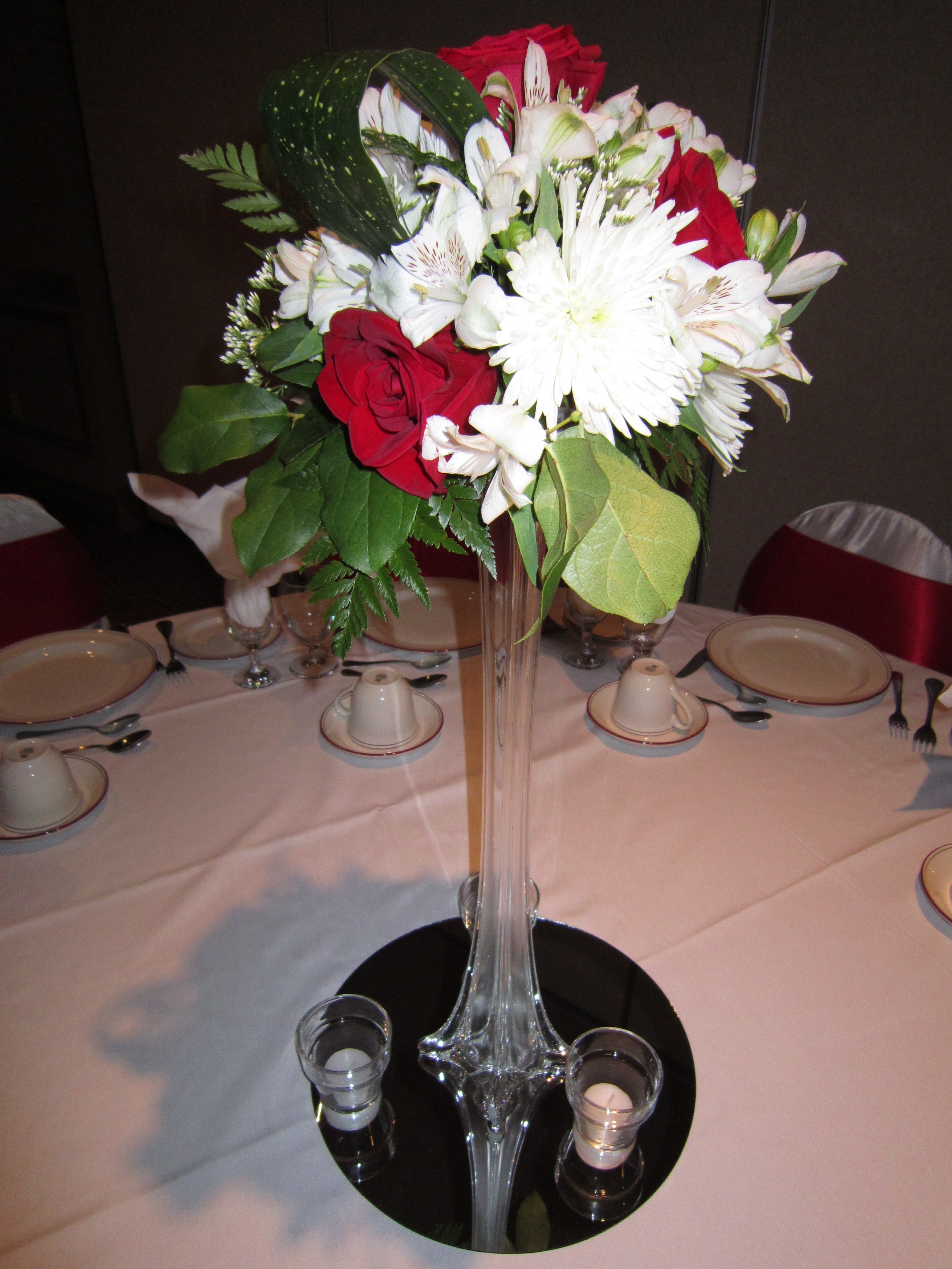 For the centerpieces we went with an Eiffel tower vase and an arrangement on top. The arrangement included, roses, alstro, spider mums, green and white fillers.