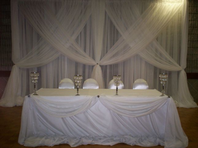 Head Table and Cake Table Draping in sheer linen with icicle lights or spotlights