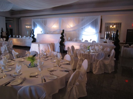 The reception space is a rustic barn so we tried to stay rustic with the colors and decor. We provided white satin pillowcase style chair covers, for the wedding feel and then plum organza sashes and table runners, bringing in the color. We did head table draping with icicle lights and full plum organza swag. The venue is already full of icicle lights so we just added to the look. Behind the head table we did a small frame of icicle lights and sheer white swag. It was not a formal backdrop but went with the theme and framed the bride and groom for photo’s at their head table. It was also setup so that if they wanted to open the large barn window they could, so also still functional.