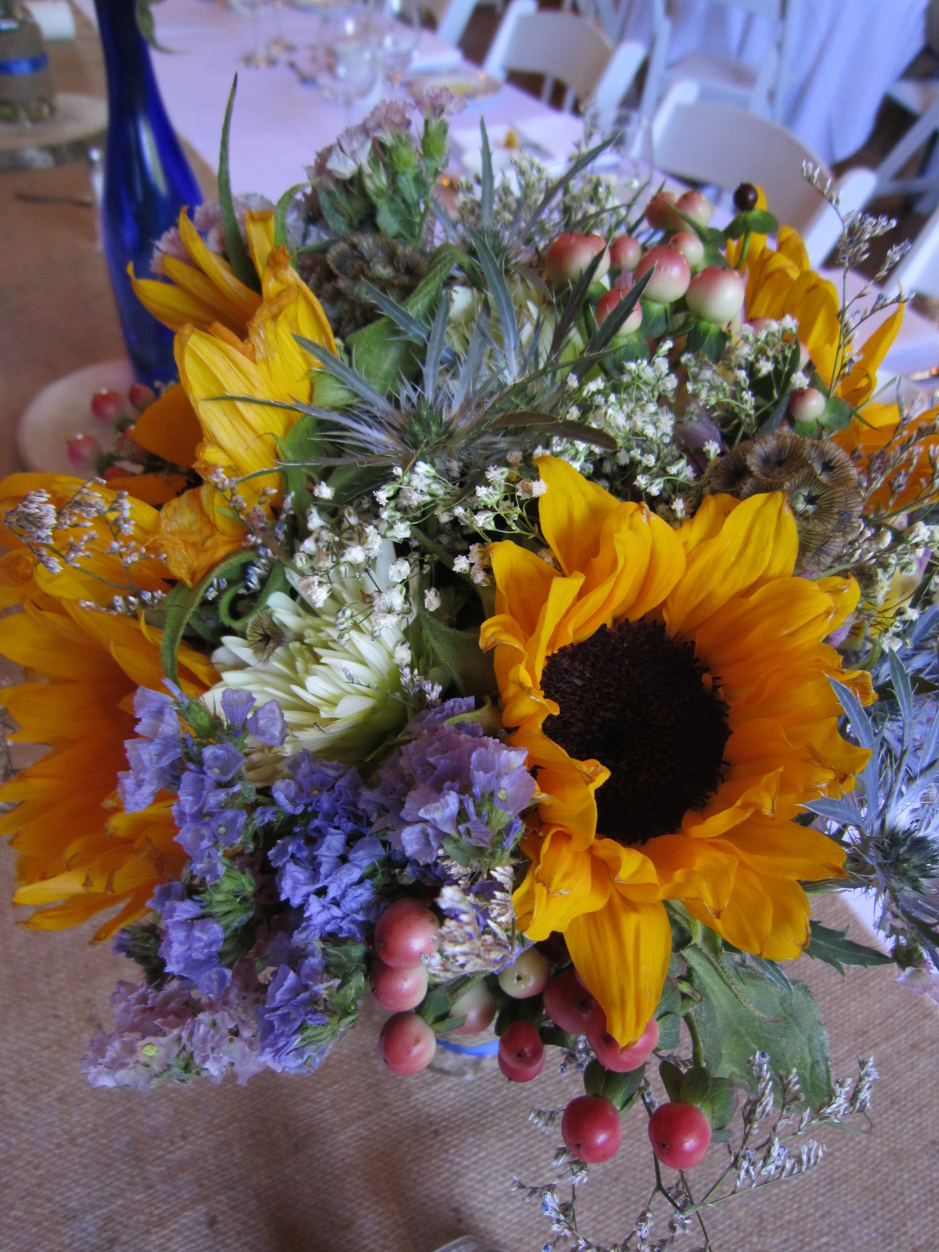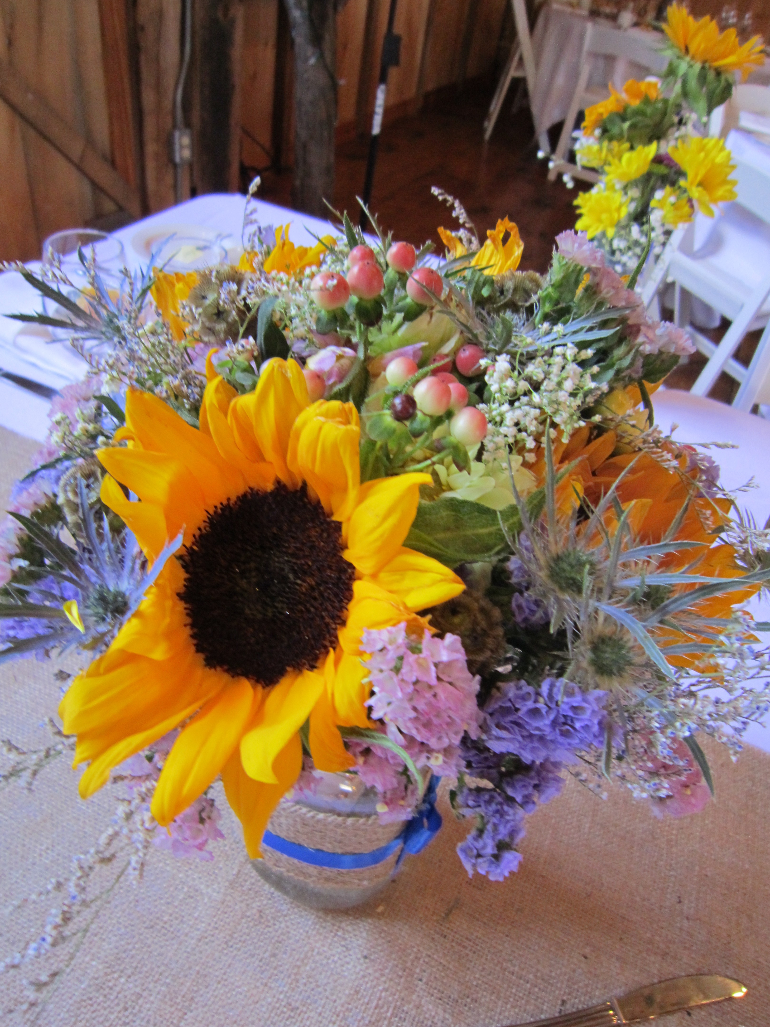Set The Mood Decor provided the flowers for the centerpieces and arranged all of them, with the star of the show being the sunflower.  The bridal bouquet and bridesmaids bouquets which had a lot of rustic flowers but keeping in the pinks and purples with a touch of light blue.