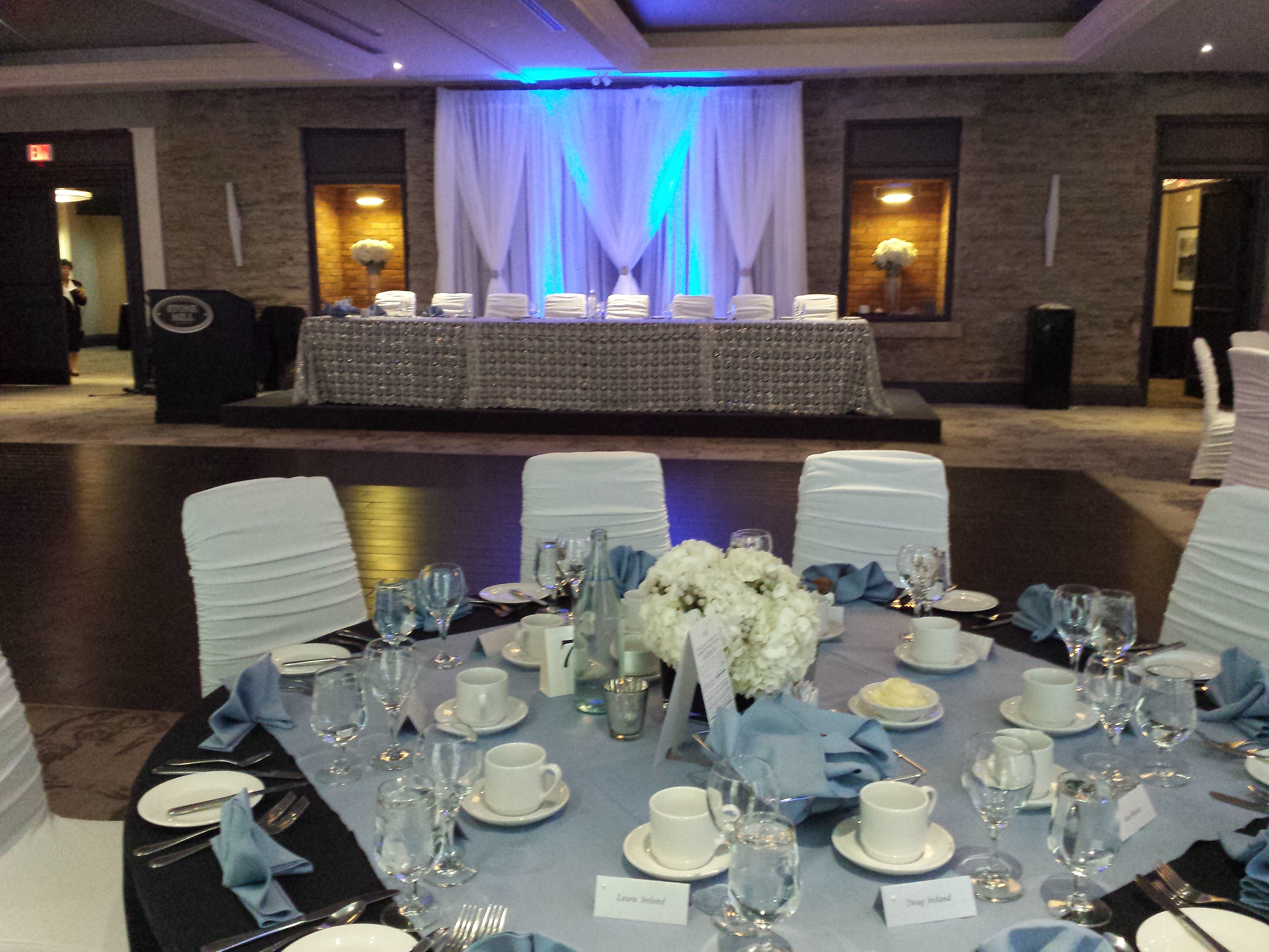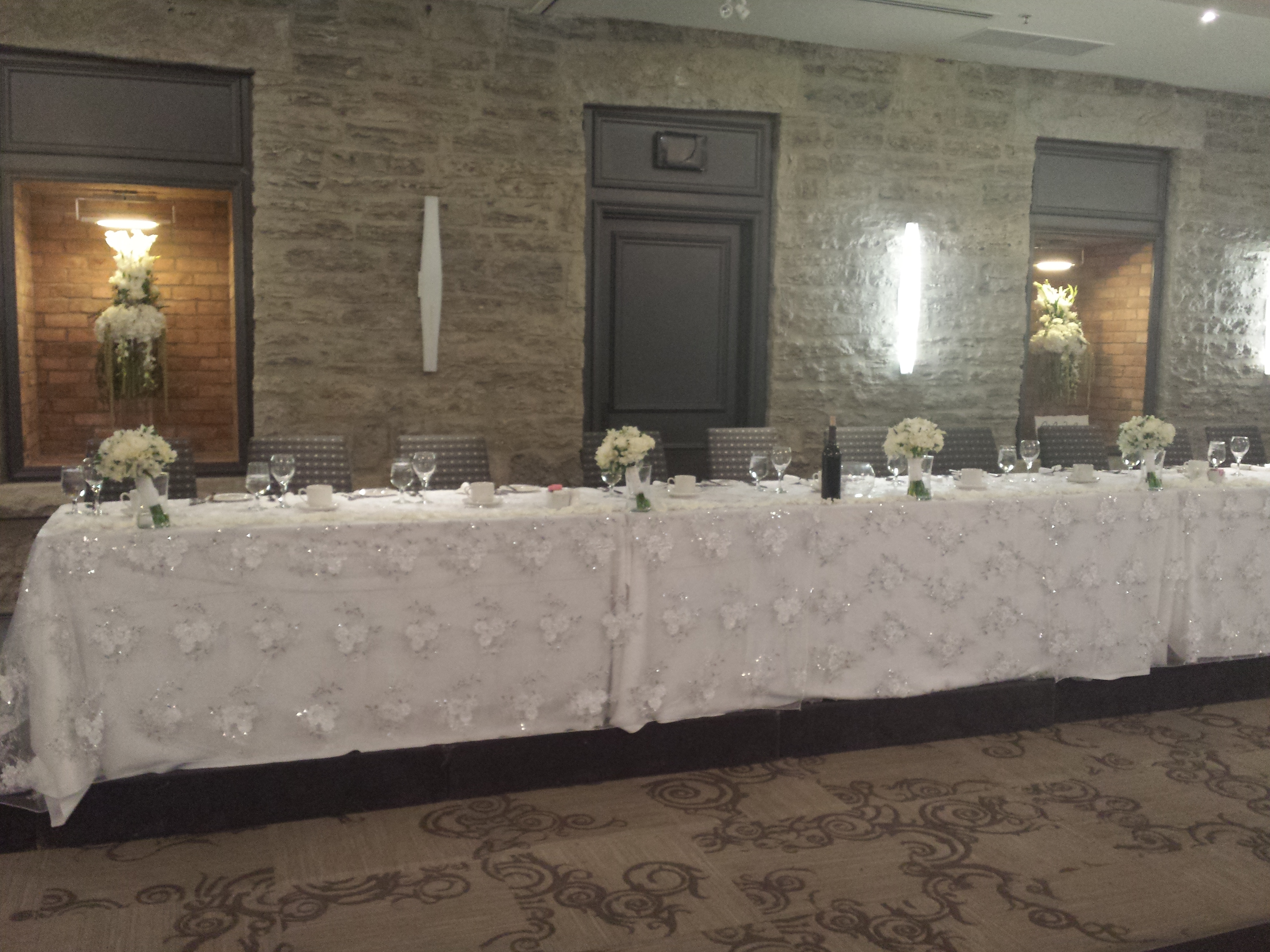 The ceremony and reception where at the Stone Mill Ballroom in St. Catharines. The venue is known for the gorgeous stone wall that we tried to work into the draping and still show off.