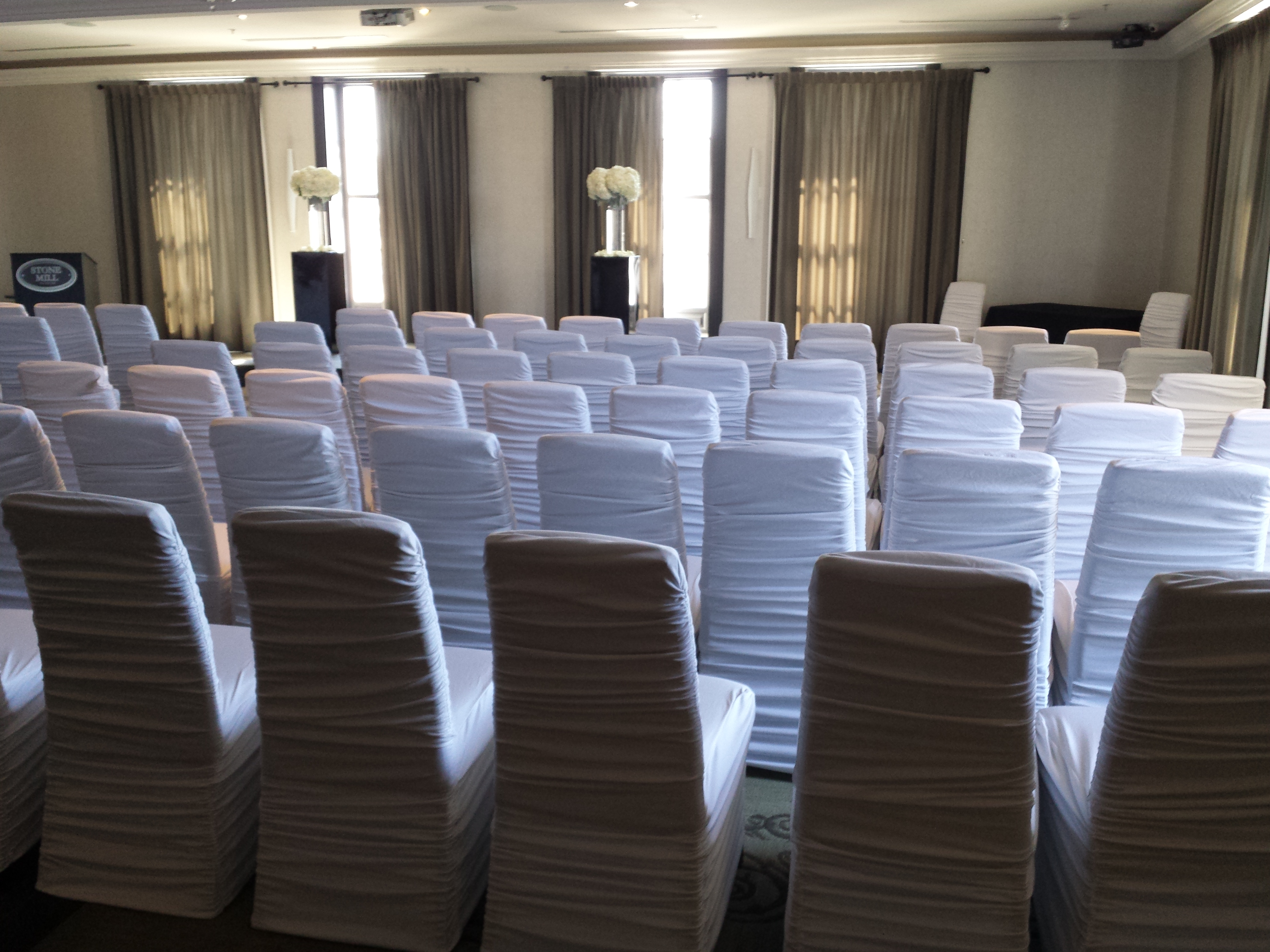 backdrop, ceremony, ceremony backdrop, ceremony entrance, chair covers, crystal wedding, niagara wedding decorator, rhinestone overlays, rusched chair covers, stonemill, wedding ceremony, wedding decor, white chair covers