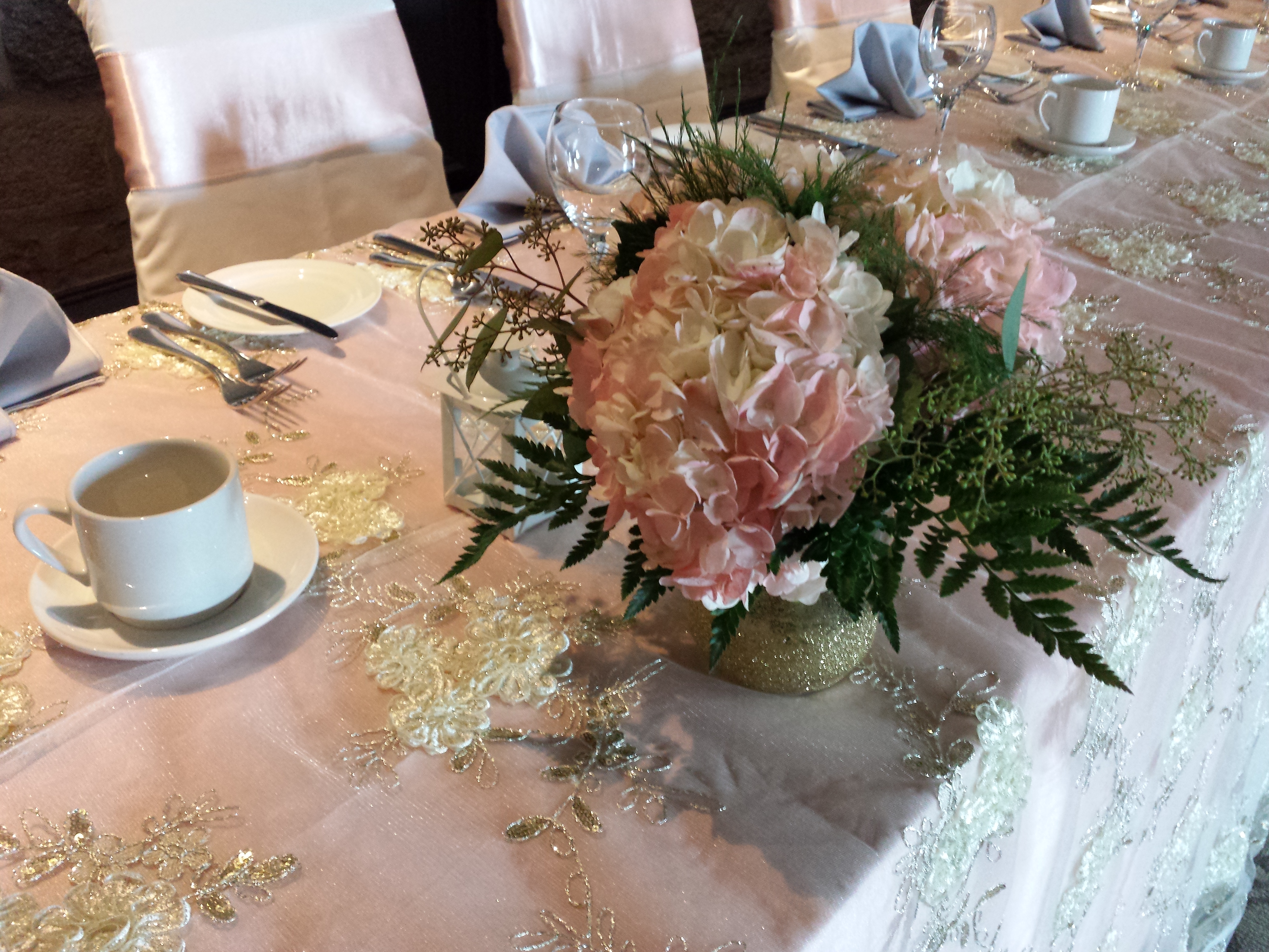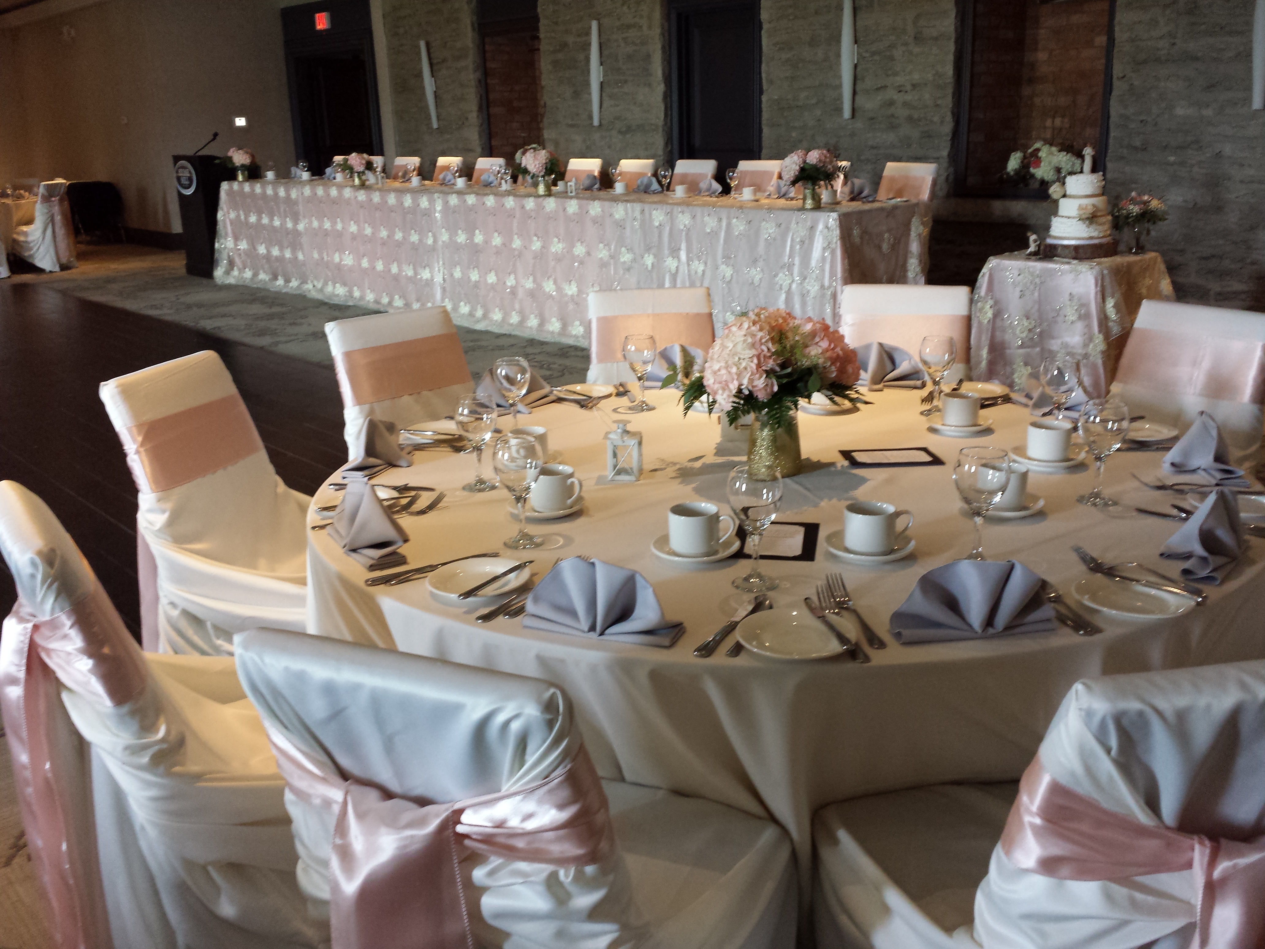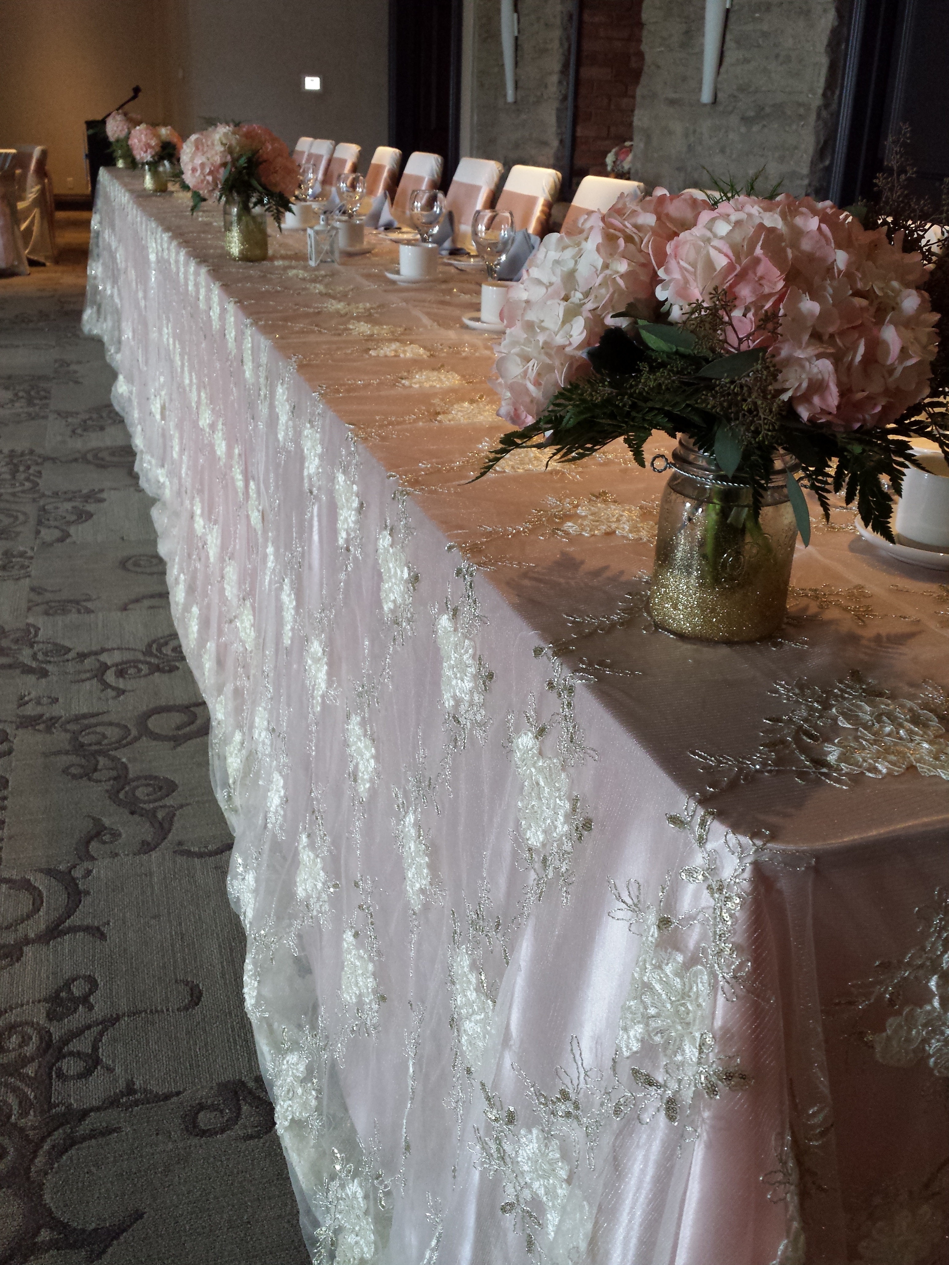 This weekends wedding was full of touches of gold sparkle, very much like the bride.  This weekend we featured our luxury Ivory and Gold Lace over top of  Blush Satin.  Ivory chair covers and blush satin sashes completed the overall look.  The grey napkins just toned down the blush a little for all of the men in the room, you never want to much pink, lol!  A few rustic touches were brought in by the bride as she also have a little country with all of that sparkle.