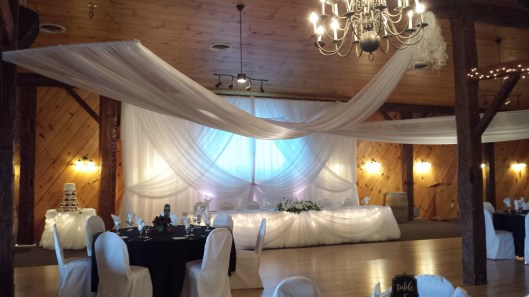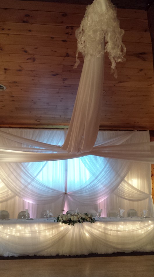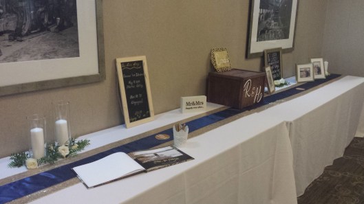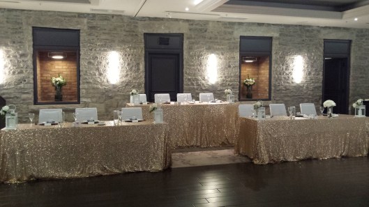 We provided white satin pillowcase style chair covers, gold sequin runners with a navy blue sash down the center and gold sequin table cloths for the head table and let’s not forget the gold chargers!!!!