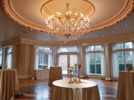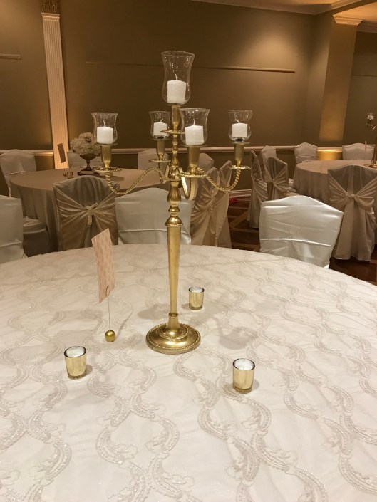 The bride alternated tables with different linens and centerpieces which I love, when done well. Our gold candelabras vs. flowers and champagne satin table cloths vs. ivory lace overlays.
