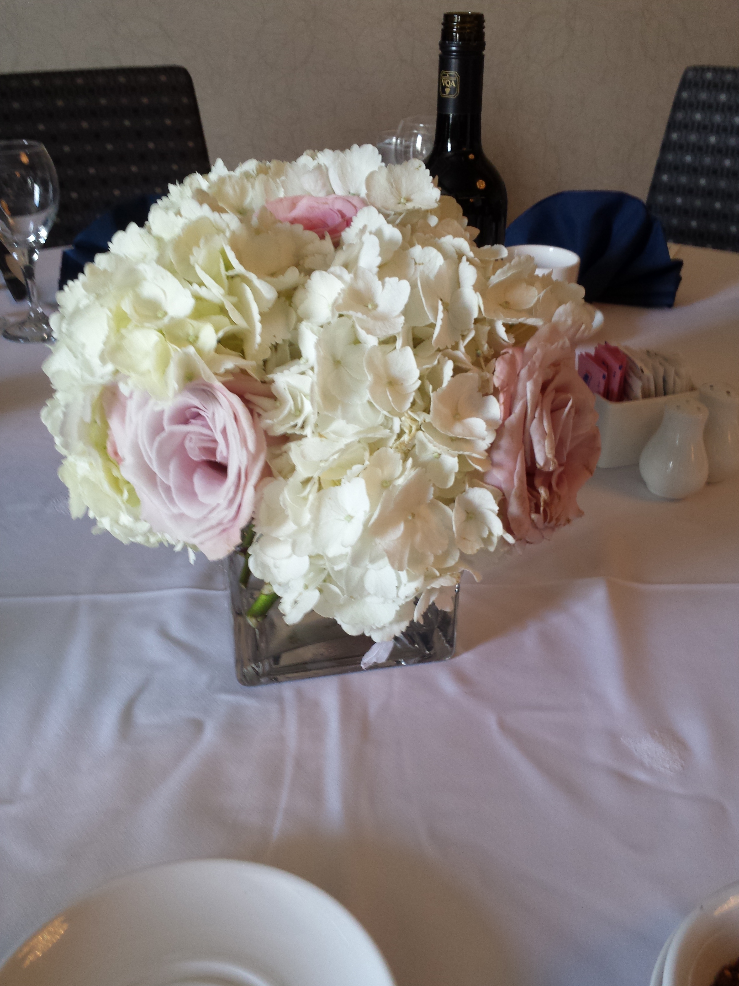 The bridal flowers had a soft look which including blush roses and light blue delphiniums, white roses and a few detail flowers to create that final look. A full wall backdrop and chair covers were also added to create the elegant wedding feel.