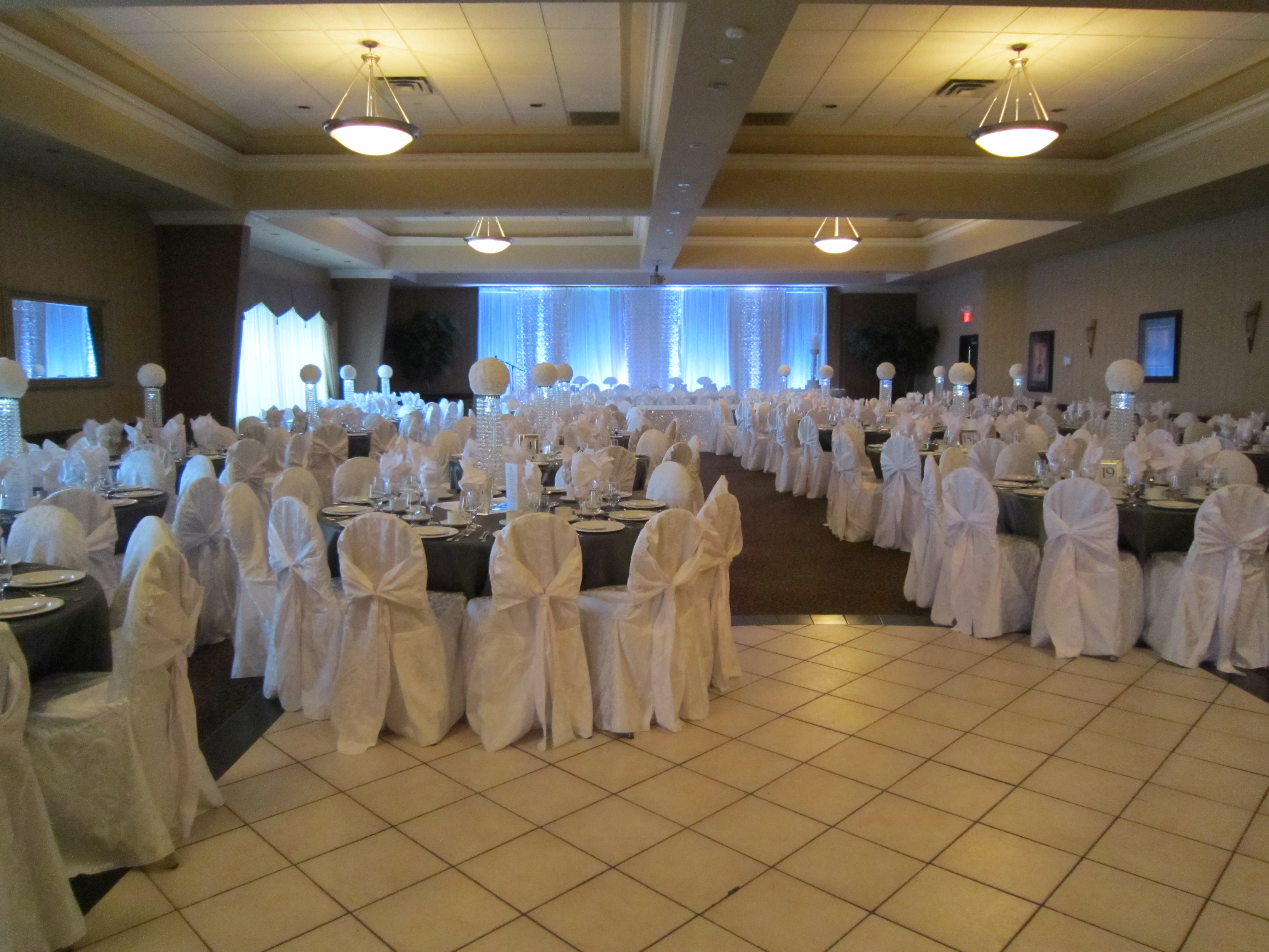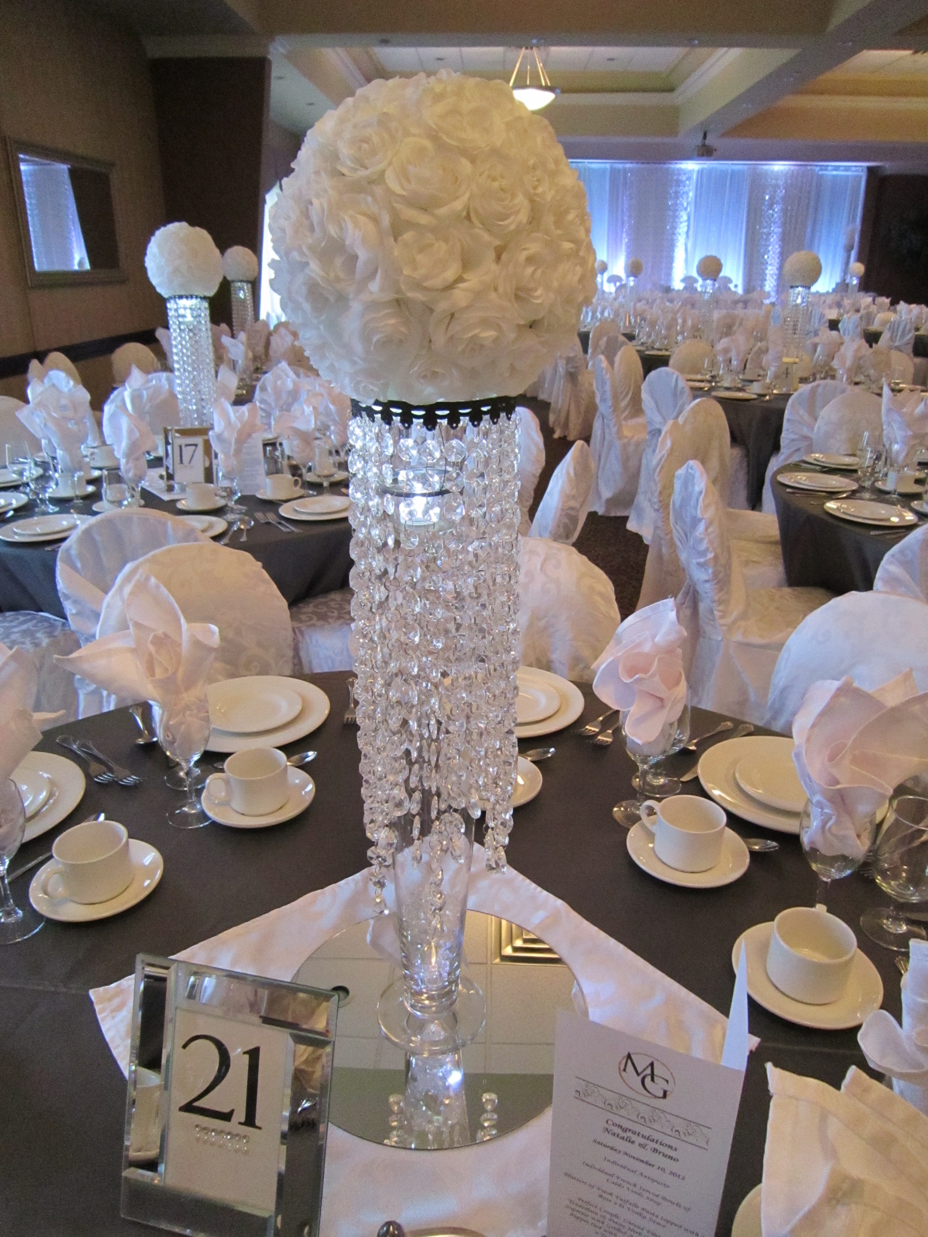 The ceremony and reception took place at Marquis Gardens in Anacaster. The ceremony was setup with a sheer white backdrop and a triangle at the focal point to create a focal point to the ceremony. We also included some stands draped in white material with vases and flower balls all dressed up to match the bride and grooms theme. The bride made the pew bows which tied everything together and had the perfect amount of crystal embellishment.
