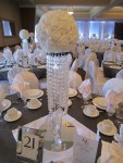 For the reception we added our fancy style chandelier backdrop which followed down onto the head table with our mini chandeliers for the head table. We completed the final touches in the reception with a dendrobium orchid in the centerpiece as well as some rhinestone napkin rings. The bride custom made the chargers for under the centerpiece to bring in the peacock feather.