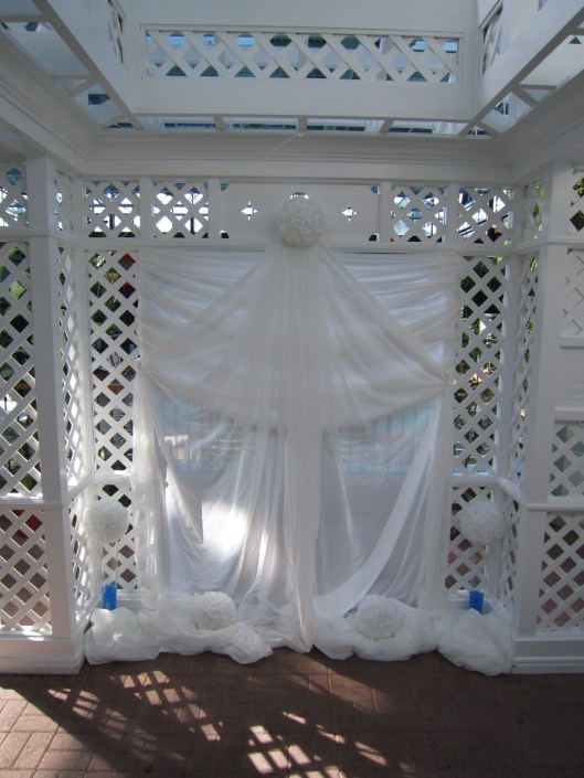 Head Table and Cake Table Draping in sheer linen with icicle lights or spotlights