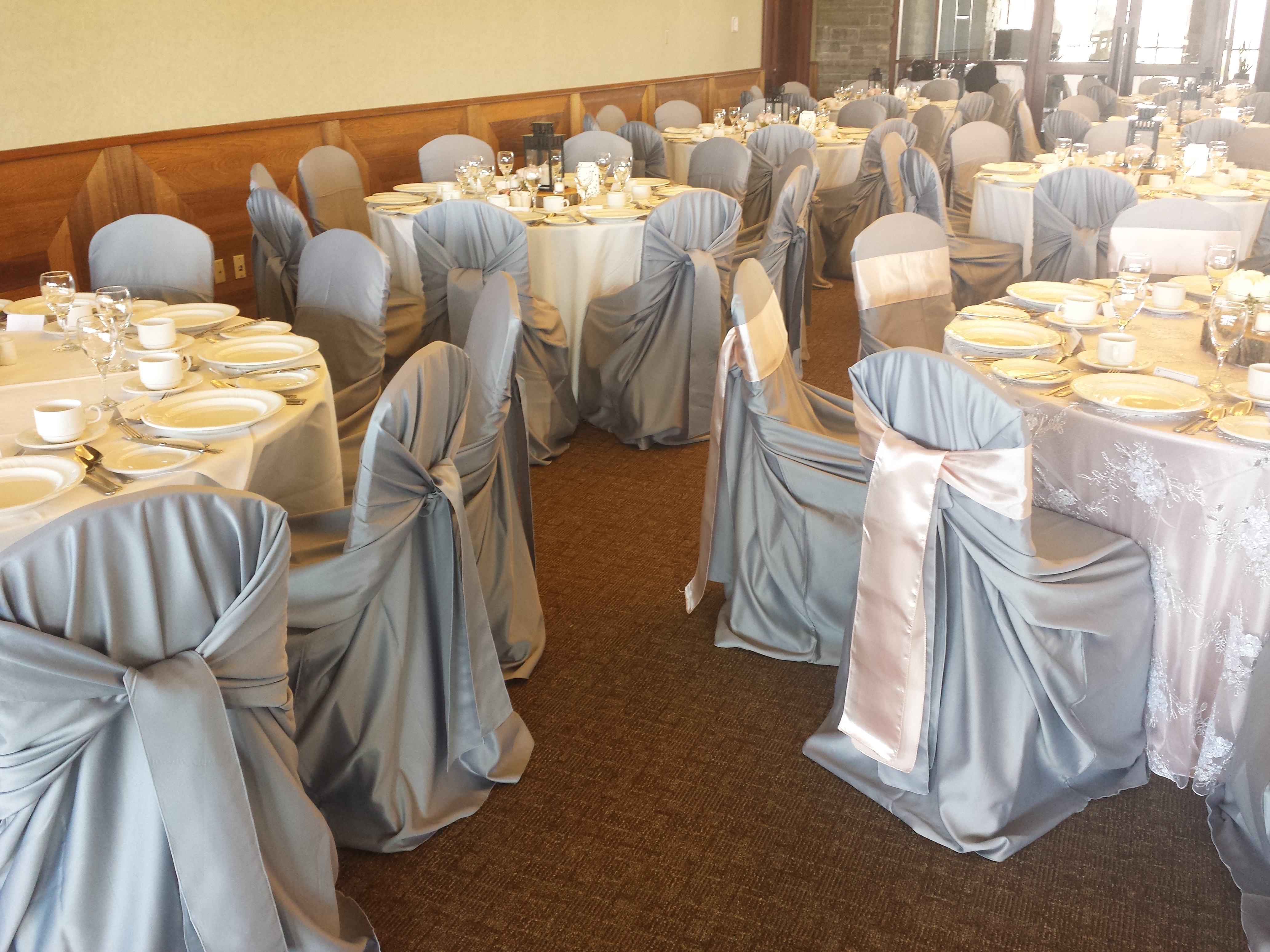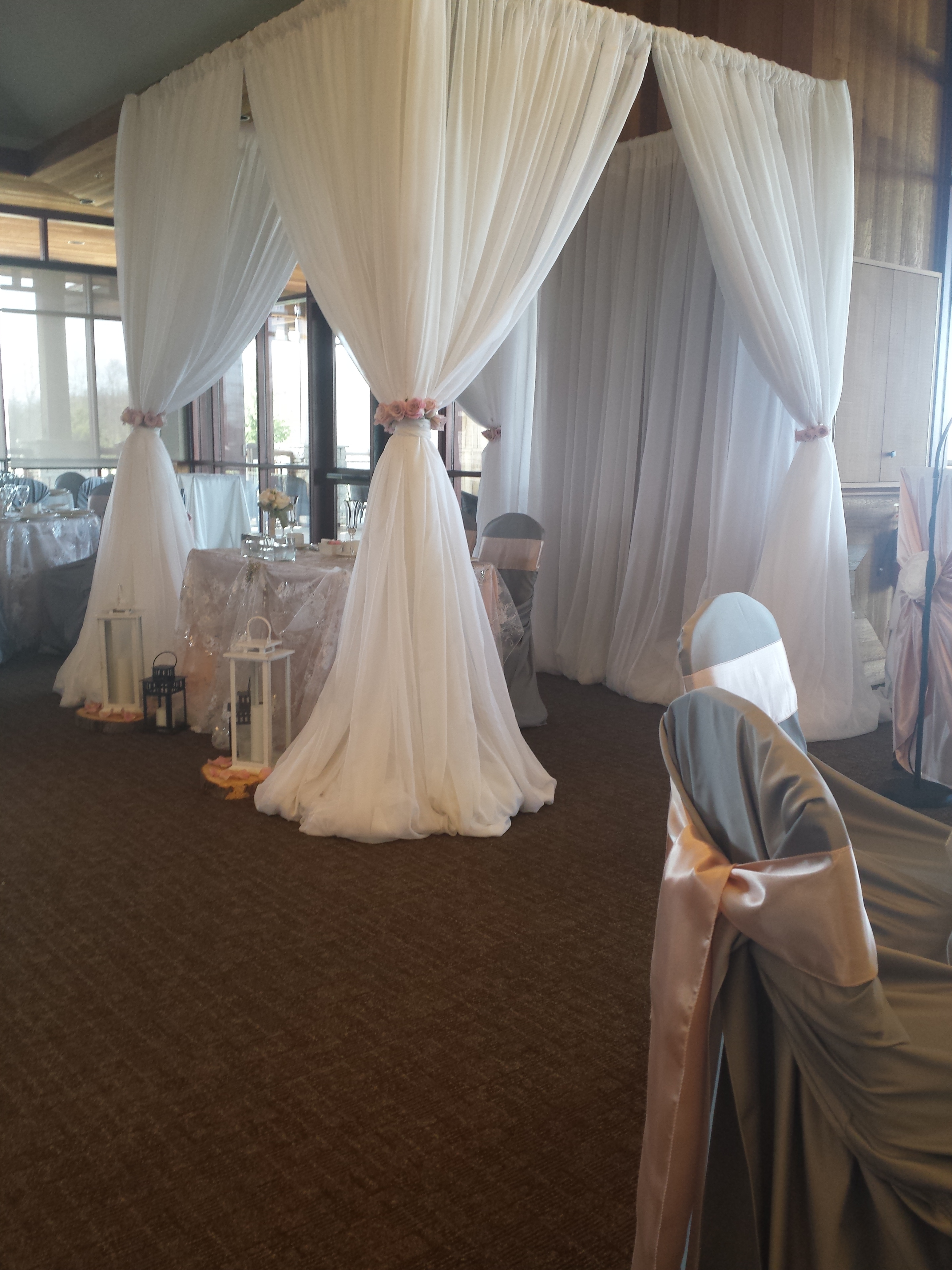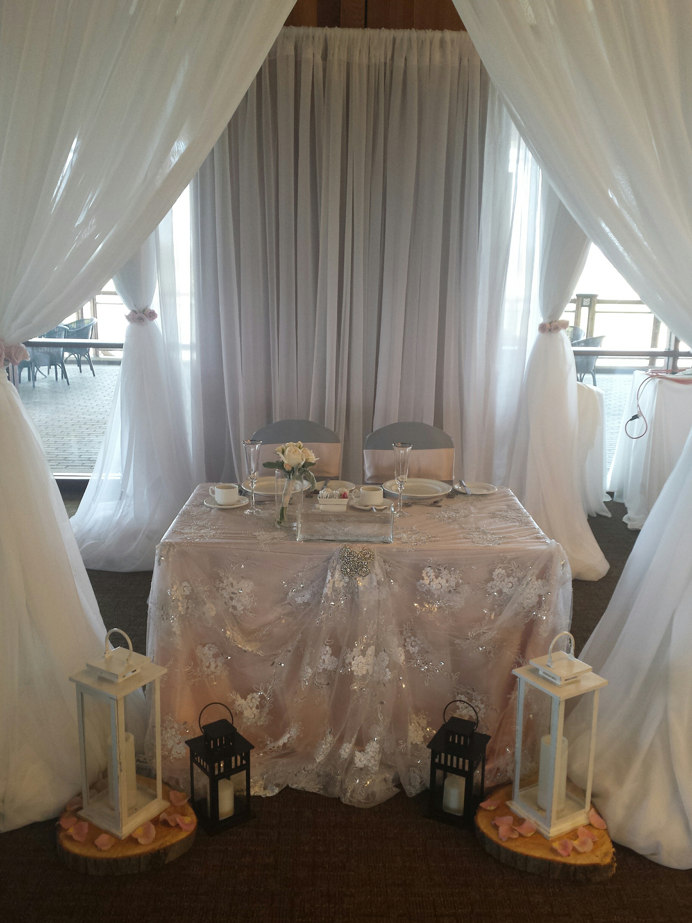 A sweetheart table and backdrop with icicle lights. Plum satin sashes tied sideways. There was also a ceremony backdrop outside on the golf course.